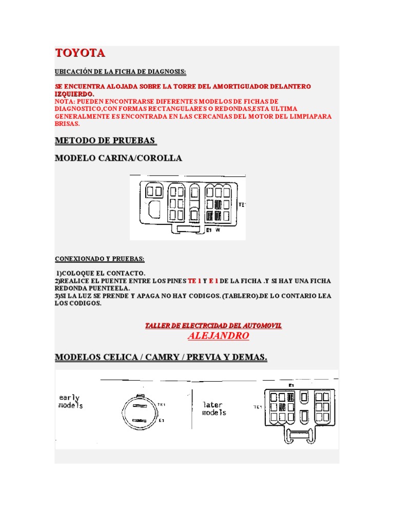 1=SISTEMA SIN AVERIAS. 2=MEDIDOR DE FLUJO DE AIRE.(NOTIENE TENCION). 3=MEDIDOR DE FLUJO DE AIRE(CIRCUITO O CENSOR). 4=SENSOR DE TEMPERATURA DE AIRE. 5=SONDA LAMBDA. 6=SEAL DE ENCENDIDO. 7=POTENCIOMETRO DE MARIPOSA. 8=SENSOR DE TEMPERATURA DE AIRE. ESTOS CODIGOS SON PARA LOS MODELOS 1983-1985-MONO PUNTO. LISTA DE CODIGOS DE FALLAS TOYOTA CELICA-CAROLAMR2-PICKUP:1985-CAMRY-CELICA-COROLLA-PICKUP-VAN:1986 COROLLA GTS-FX 16-PICKUP-VAN:1986 RUNNER-PICKUP TURBO-MR 2:1988. 1=SISTEMA SIN AVERIAS. 2=MEDIDOR DE FLUJO DE AIRE(NO TIENE TENCION). 3=SEAL DE IGNICION. 4=SENSOR DE TEMPERATURA DE AGUA (SIN SEAL). 5=SONDA LAMBDA. 6=CAPTADOR DE SEAL DE PMS Y RPM. 7=POTENCIOMETRO MARIPOSA. 8=SENSOR DE TEMPERATURA DE AIRE. 10=SIN SEAL DE ARRANQUE. 11=MODULO. 11=INTERRUPTOR DEL A/A. 11=RELE DE INYECCION. 12=CAPTADOR DE PMS Y RPM. 12=SENSOR DE DETONACION. 13=CAPTADOR DE PMS Y RPM O SEAL DE IGNICION. 13=SENSOR DE DETONACION. 14=SEAL DE PMS Y RPM. 14=PRECION DEL TURBO CARGADOR. LISTA DE CODIGOS DE FALLAS TOYOTA(TODOS LOS DEMAS).