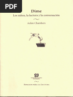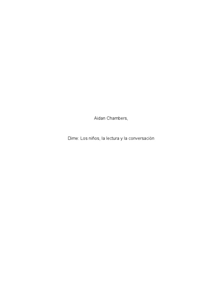 Vivimos en la era de la conversacin. Nunca antes las personas haban hablado tanto. El telfono, la radio, el cine, la televisin y las grabaciones en audio y video han incrementado nuestras oportunidades de conversar, no slo cuando estamos fsicamente juntos, sino a travs de la distancia y el tiempo. ste ha sido el siglo de la pltica. Hubo un tiempo en que a los nios se les enseaba que podan ser vistos, pero no odos. Hoy da a los adultos se los critica por no escuchar lo suficiente a los nios, a quienes se estimula dentro y fuera de la escuela para que expresen sus ideas. En estos das, a todos se nos juzga por cmo nos expresamos -y no hablamos ni escuchamos ms, ni con ms atencin que la que pusieron nuestros predecesores en pocas menos volubles. Dime trata de cmo ayudar a los nios a hablar bien sobre los libros que han ledo. Y no slo a hablar bien, sino tambin a escuchar bien (a qu me refiero con bien se ir aclarando espero- en el camino). Y a hablar bien no slo sobre los libros, sino sobre cualquier texto, desde los signos de una palabra hasta los escritos que llamamos literatura, que es el tipo de texto en el que me voy a concentrar. Dime se complementa con El ambiente de la lectura, que se ocupa de cmo los adultos pueden ayudar a los nios a gozar de sus libros, ofrecindoles un contexto y una organizacin de actividades compartidas que estimulen a los nios a leer vida y reflexivamente. Al igual que su acompaante, este libro est dirigido a las personas que trabajan con los nios y los libros, particularmente maestros: a aquellos que quieren actualizar y revisar su prctica y a quienes recin comienzan su carrera