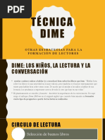 El enfoque de Dime parte de este modo conversacional bsico, e intenta extenderlo de los patrones del uno a uno, nio y adulto, a un adulto facilitador con una comunidad de lectores cuyo inters est concentrado en un texto comn. Como actividad, el tipo de conversacin que bosqueja Dime es individual y al mismo tiempo comunitaria y cooperativa, pues cada participante debe escuchar lo que tienen para decir los otros y tomar en cuenta lo que piensan lo dems del libro.