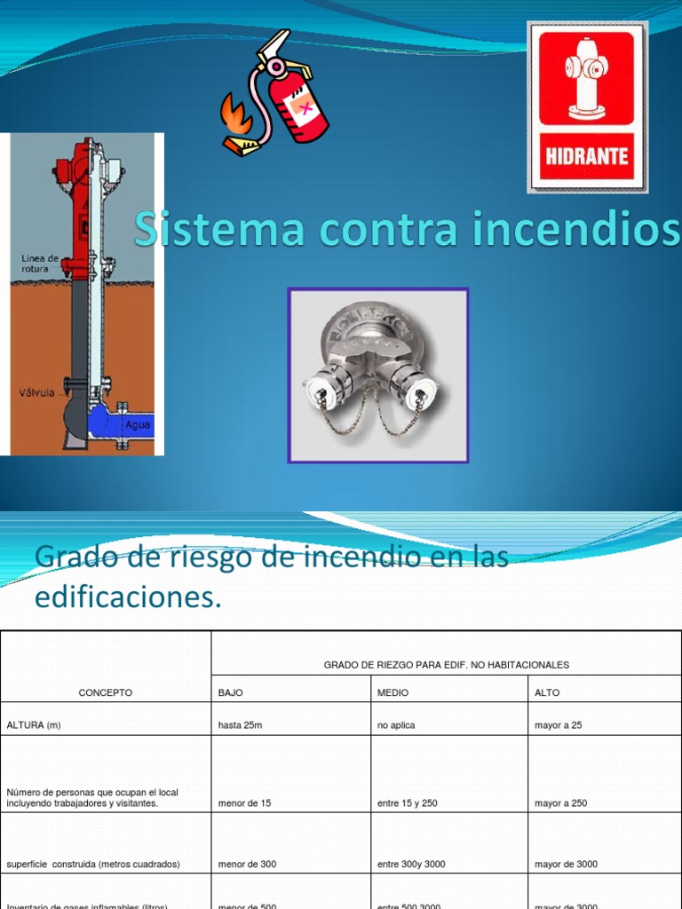 un sistema deteccin de incendios en la zona de risgo(un detector de humo por cada 80 m2 o fraccin con control central) y detectores de fuego en cada caso que se manejen gases combustibles. En vivienda plurifamiliar, uno por cada vivienda y no se requiere control central.