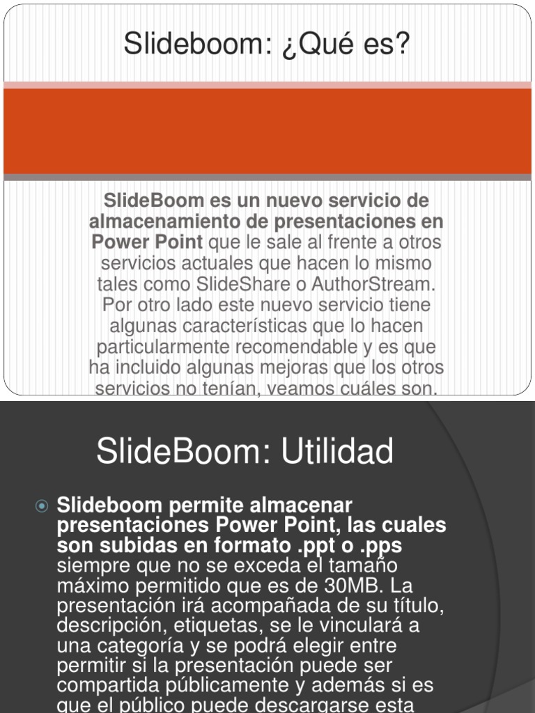 Slideboom permite almacenar presentaciones Power Point, las cuales son subidas en formato .ppt o .pps siempre que no se exceda el tamao mximo permitido que es de 30MB. La presentacin ir acompaada de su ttulo, descripcin, etiquetas, se le vincular a una categora y se podr elegir entre permitir si la presentacin puede ser compartida pblicamente y adems si es que el pblico puede descargarse esta presentacin.