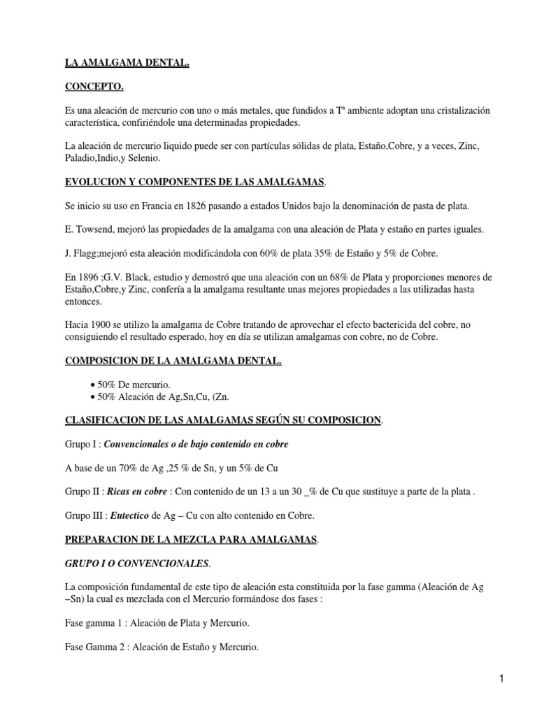 Es una aleacin de mercurio con uno o ms metales, que fundidos a T ambiente adoptan una cristalizacin caracterstica, confirindole una determinadas propiedades. La aleacin de mercurio liquido puede ser con partculas slidas de plata, Estao,Cobre, y a veces, Zinc, Paladio,Indio,y Selenio. EVOLUCION Y COMPONENTES DE LAS AMALGAMAS. Se inicio su uso en Francia en 1826 pasando a estados Unidos bajo la denominacin de pasta de plata. E. Towsend, mejor las propiedades de la amalgama con una aleacin de Plata y estao en partes iguales. J. Flagg;mejor esta aleacin modificndola con 60% de plata 35% de Estao y 5% de Cobre. En 1896 ;G.V. Black, estudio y demostr que una aleacin con un 68% de Plata y proporciones menores de Estao,Cobre,y Zinc, confera a la amalgama resultante unas mejores propiedades a las utilizadas hasta entonces. Hacia 1900 se utilizo la amalgama de Cobre tratando de aprovechar el efecto bactericida del cobre, no consiguiendo el resultado esperado, hoy en da se utilizan amalgamas con cobre, no de Cobre. COMPOSICION DE LA AMALGAMA DENTAL. 50% De mercurio. 50% Aleacin de Ag,Sn,Cu, (Zn. CLASIFICACION DE LAS AMALGAMAS SEGN SU COMPOSICION. Grupo I : Convencionales o de bajo contenido en cobre A base de un 70% de Ag ,25 % de Sn, y un 5% de Cu Grupo II : Ricas en cobre : Con contenido de un 13 a un 30 _% de Cu que sustituye a parte de la plata . Grupo III : Eutectico de Ag Cu con alto contenido en Cobre. PREPARACION DE LA MEZCLA PARA AMALGAMAS. GRUPO I O CONVENCIONALES. La composicin fundamental de este tipo de aleacin esta constituida por la fase gamma (Aleacin de Ag Sn) la cual es mezclada con el Mercurio formndose dos fases : Fase gamma 1 : Aleacin de Plata y Mercurio. Fase Gamma 2 : Aleacin de Estao y Mercurio. 1