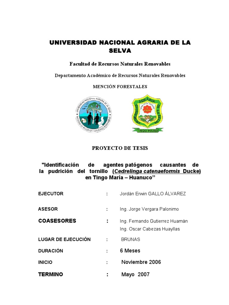 PROYECTO DE TESIS "Identificacin de agentes patgenos causantes de la pudricin del tornillo (Cedrelinga catenaeformis Ducke) en Tingo Mara Huanuco