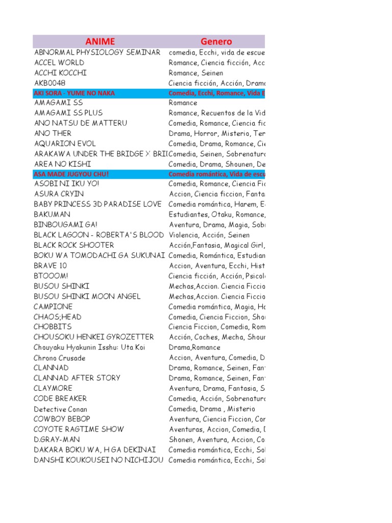 ABNORMAL PHYSIOLOGY SEMINAR comedia, Ecchi, vida de escuela, fetichismo, otakus ACCEL WORLD Romance, Ciencia ficcin, Accin, avatar, colegio ACCHI KOCCHI Romance, Seinen AKB0048 Ciencia ficcin, Accin, Drama, Musical AKI SORA - YUME NO NAKA Comedia, Ecchi, Romance, Vida Escolar , Hentai Soft AMAGAMI SS Romance AMAGAMI SS PLUS Romance, Recuentos de la Vida, Drama ANO NATSU DE MATTERU Comedia, Romance, Ciencia ficcin ANO THER Drama, Horror, Misterio, Terror, gore AQUARION EVOL Comedia, Drama, Romance, Ciencia ficcin, Accin, Fantasa ARAKAWA UNDER THE BRIDGE X BRIDGE Comedia, Seinen, Sobrenatural, Romance AREA NO KISHI Comedia, Drama, Shounen, Deportes, Futbol, Vida de escuela ASA MADE JUGYOU CHU! Comedia romntica, Vida de escuela, Ecchi, Soft Hentai ASOBI NI IKU YO! Comedia, Romance, Ciencia Ficcin, Ecchi ASURA CRYIN Accion, Ciencia ficcion, Fantasia, Mecha, Seinen BABY PRINCESS 3D PARADISE LOVE Comedia romntica, Harem, Ecchi, Loli, bishojo BAKUMAN Estudiantes, Otaku, Romance, Comedia BINBOUGAMI GA! Aventura, Drama, Magia, Sobrenatural, Fantasia BLACK LAGOON - ROBERTA'S BLOOD Violencia, Accin, Seinen BLACK ROCK SHOOTER Accin,Fantasia, Magical Girl, Recuentos de la vida, Yuri BOKU WA TOMODACHI GA SUKUNAI Comedia, Romntica, Estudiantil, Seinen BRAVE 10 Accion, Aventura, Ecchi, Historico, Seinen BTOOOM! Ciencia ficcin, Accin, Psicolgico, Seinen BUSOU SHINKI Mechas,Accion. Ciencia Ficcion, Ecchi, cosas de vida BUSOU SHINKI MOON ANGEL Mechas,Accion. Ciencia Ficcion, Ecchi CAMPIONE Comedia romntica, Magia, Harem, Ecchi, Sobrenatural, Shonen, Mit CHAOS;HEAD Comedia, Ciencia Ficcion, Shoujo, Romance, Violencia, Psicolgico, Ho CHOBBITS Ciencia Ficcion, Comedia, Romantica, Seinen CHOUSOKU HENKEI GYROZETTER Accin, Coches, Mecha, Shounen Chouyaku Hyakunin Isshu: Uta Koi Drama,Romance Accion, Aventura, Comedia, Drama, Fantasia, Romance, Shounen Chrono Crusade CLANNAD Drama, Romance, Seinen, Fantasia, Misterio, Colegio CLANNAD AFTER STORY Drama, Romance, Seinen, Fantasia, Misterio, Colegio CLAYMORE Aventura, Drama, Fantasia, Shounen, Sobrenatural, Violencia CODE BREAKER Comedia, Accin, Sobrenatural, Shounen Comedia, Drama , Misterio Detective Conan COWBOY BEBOP Aventura, Ciencia Ficcion, Comedia, Drama, Shounen COYOTE RAGTIME SHOW Aventuras, Accion, Comedia, Drama, Suspenso [Link]-MAN Shonen, Aventura, Accion, Comedia DAKARA BOKU WA, H GA DEKINAI Comedia romntica, Ecchi, Sobrenatural, Harem DANSHI KOUKOUSEI NO NICHIJOU Comedia romntica, Ecchi, Sobrenatural, Harem