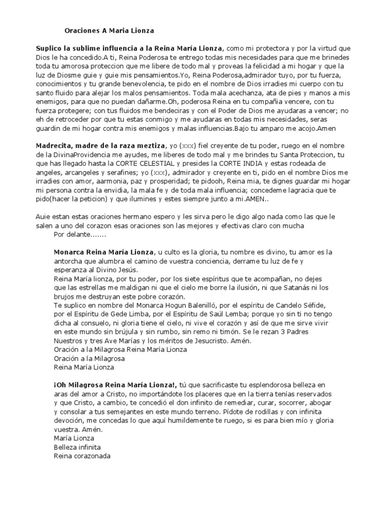 le ha concedido.A ti, Reina Poderosa te entrego todas mis necesidades para que me brinedes toda tu amorosa proteccion que me libere de todo mal y proveas la felicidad a mi hogar y que la luz de Diosme guie y guie mis pensamientos.Yo, Reina Poderosa,admirador tuyo, por tu fuerza, conocimientos y tu grande benevolencia, te pido en el nombre de Dios irradies mi cuerpo con tu santo fluido para alejar los malos pensamientos. Toda mala acechanza, ata de pies y manos a mis enemigos, para que no puedan daarme.Oh, poderosa Reina en tu compaia vencere, con tu fuerza protegere; con tus fluidos me bendeciras y con el Poder de Dios me ayudaras a vencer; no eh de retroceder por que tu estas conmigo y me ayudaras en todas mis necesidades, seras guardin de mi hogar contra mis enemigos y malas influencias.Bajo tu amparo me acojo.Amen Madrecita, madre de la raza meztiza, yo (xxx) fiel creyente de tu poder, ruego en el nombre de la DivinaProvidencia me ayudes, me liberes de todo mal y me brindes tu Santa Proteccion, tu que has llegado hasta la CORTE CELESTIAL y presides la CORTE INDIA y estas rodeada de angeles, arcangeles y serafines; yo (xxx), admirador y creyente en ti, pido en el nombre Dios me irradies con amor, aarmonia, paz y prosperidad; te pidooh, Reina mia, te dignes guardar mi hogar mi persona contra la envidia, la mala fe y de toda mala influencia; concedeme lagracia que te pido(hacer la peticion) y que ilumines y estes siempre junto a mi.AMEN.. Auie estan estas oraciones hermano espero y les sirva pero le digo algo nada como las que le salen a uno del corazon esas oraciones son las mejores y efectivas claro con mucha Por delante....... Monarca Reina Mara Lionza, u culto es la gloria, tu nombre es divino, tu amor es la antorcha que alumbra el camino de vuestra conciencia, derrame tu luz de fe y esperanza al Divino Jess. Reina Mara lionza, por tu poder, por los siete espritus que te acompaan, no dejes que las estrellas me maldigan ni que el cielo me borre la ilusin, ni que Satans ni los brujos me destruyan este pobre corazn. Te suplico en nombre del Monarca Hogun Balenill, por el espritu de Candelo Sfide, por el Espritu de Gede Limba, por el Espritu de Sal Lemba; porque yo sin ti no tengo dicha al consuelo, ni gloria tiene el cielo, ni vive el corazn y as de que me sirve vivir en este mundo sin brjula y sin rumbo, sin remo ni timn. Se le rezan 3 Padres Nuestros y tres Ave Maras y los mritos de Jesucristo. Amn. Oracin a la Milagrosa Reina Mara Lionza Oracin a la Milagrosa Reina Mara Lionza Oh Milagrosa Reina Mara Lionza!, t que sacrificaste tu esplendorosa belleza en aras del amor a Cristo, no importndote los placeres que en la tierra tenas reservados y que Cristo, a cambio, te concedi el don infinito de remediar, curar, socorrer, abogar y consolar a tus semejantes en este mundo terreno. Pdote de rodillas y con infinita devocin, me concedas lo que aqu humildemente te ruego, si es para bien mo y gloria vuestra. Amn. Mara Lionza Belleza infinita Reina corazonada