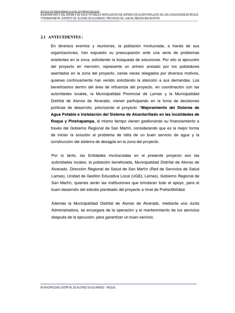 2.1 ANTECEDENTES : En diversos eventos y reuniones, la poblacin involucrada, a travs de sus organizaciones, han expuesto su preocupacin ante una serie de problemas existentes en la zona, solicitando la bsqueda de soluciones. Por ello la ejecucin del proyecto en mencin, representa un anhelo ansiado por los pobladores asentados en la zona del proyecto, varias veces relegados por diversos motivos, quienes continuamente han venido solicitando la atencin a sus demandas. Los beneficiarios dentro del rea de influencia del proyecto, en coordinacin con las autoridades locales, la Municipalidad Provincial de Lamas y la Municipalidad Distrital de Alonso de Alvarado, vienen participando en la toma de decisiones polticas de desarrollo, priorizando el proyecto Mejoramiento del Sistema de Agua Potable e Instalacin del Sistema de Alcantarillado en las localidades de Roque y Pinshapampa, al mismo tiempo vienen gestionando su financiamiento a travs del Gobierno Regional de San Martn, considerando que es la mejor forma de iniciar la solucin al problema de falta de un buen servicio de agua y la construccin del sistema de desage en la zona del proyecto. Por lo tanto, las Entidades involucradas en el presente proyecto son las autoridades locales, la poblacin beneficiada, Municipalidad Distrital de Alonso de Alvarado, Direccin Regional de Salud de San Martn (Red de Servicios de Salud Lamas), Unidad de Gestin Educativa Local (UGEL Lamas), Gobierno Regional de San Martn, quienes sern las instituciones que brindaran todo el apoyo, para el buen desarrollo del estudio planteado del proyecto a nivel de Prefactibilidad.