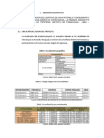 Sistema de Agua Potable Consiste en el Mejoramiento, del sistema de agua potable existente, acciones planteadas para ambas alternativas del proyecto, donde se realizaran trabajos de mejoramiento de la Captacin existente, instalacin de una nueva lnea de conduccin paralela a la existente, con tuberas de dimetro adecuado, Construccin de un Sedimentado, Prefiltros, Filtros Lentos, construccin de un Reservorio y la ampliacin y mejoramiento de las redes de Aduccin y Distribucin y la instalacin de conexiones domiciliarias. La fuente de Abastecimiento ser la quebrada Pashcana, cuyo aforo y caudal es el necesario y suficiente para dotar de agua a toda la poblacin beneficiaria durante todo el horizonte del proyecto. El Mejoramiento del sistema de agua potable estar formado por lo siguiente: Captacin (Mejoramiento de la Infraestructura existente) Construccin de Sedimentador. Construccin de Prefiltros Construccin de Filtros Lentos Instalacin de 1,715 ml de Lnea de Conduccin (PVC-P de 4) Construccin de Reservorio de 200m3 de capacidad. Instalacin de Lneas de Aduccin y Distribucin con una longitud total de 10,250 ml. (PVC-P de 2 y 3 de dimetro), (ver presupuesto) Instalacin de Conexiones Domiciliarias con 994 usuarios conectados. Programas de Mitigacin y Educacin Ambiental a toda la poblacin beneficiaria.
