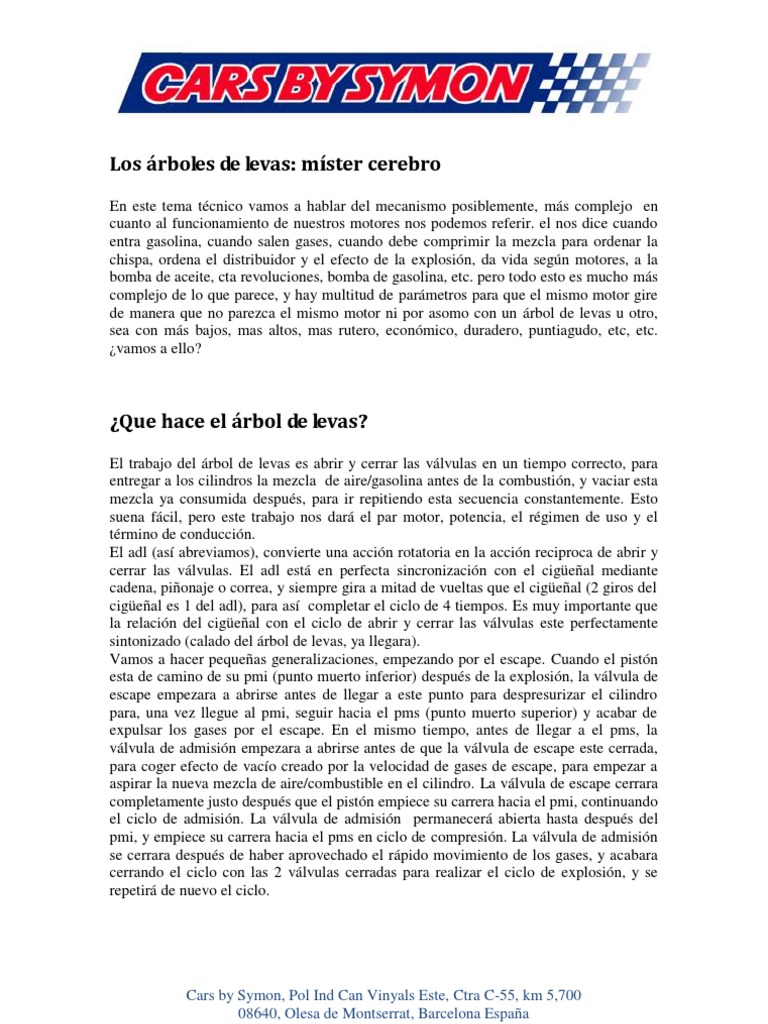 Esquema de actuacin de las levas en un ciclo completo de 4 tiempos Cars by Symon, Pol Ind Can Vinyals Este, Ctra C-55, km 5,700 08640, Olesa de Montserrat, Barcelona Espaa Telfono: (+34) 902 15 65 15, Fax (+34) 902 15 75 15, recambios@[Link]