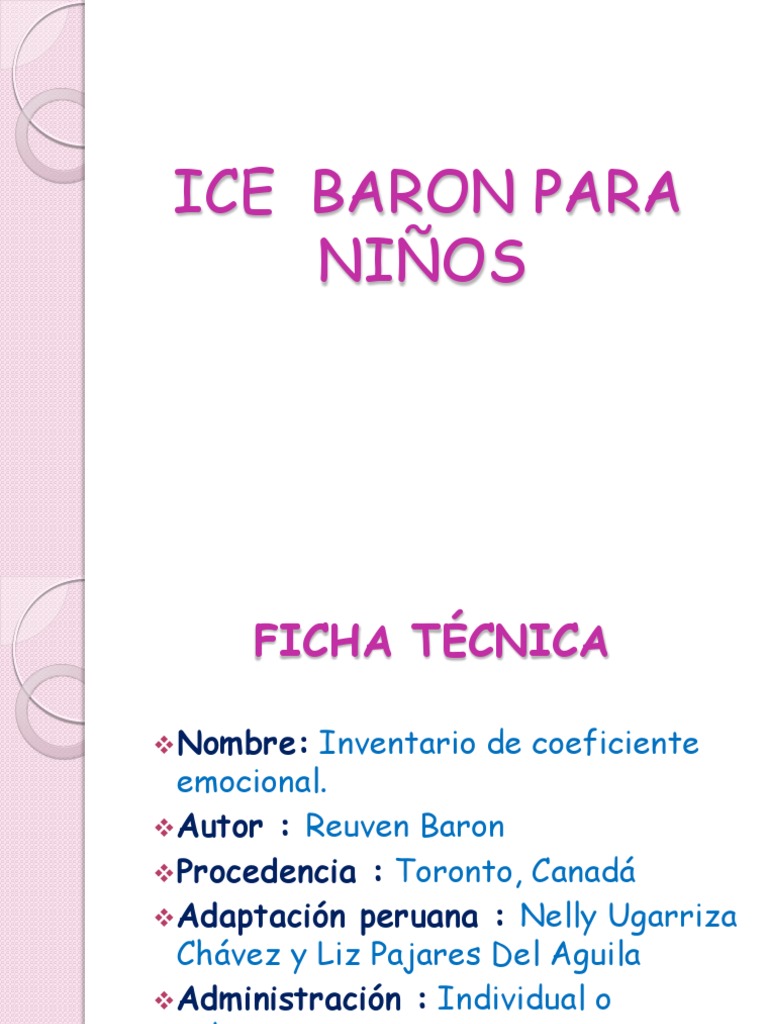 Inventario de coeficiente emocional. Autor : Reuven Baron Procedencia : Toronto, Canad Adaptacin peruana : Nelly Ugarriza Chvez y Liz Pajares Del Aguila Administracin : Individual o colectiva. Formas : Formas completa y abreviada