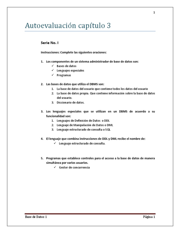 Instrucciones: Complete las siguientes oraciones: 1. Los componentes de un sistema administrador de base de datos son: Bases de datos Lenguajes especiales Programas 2. Las bases de datos que utiliza el DBMS son: 1. La base de datos del usuario que contiene todos los datos del usuario 2. La base de datos propia. Que contiene informacin sobre la base de datos del usuario. 3. Diccionario de datos. 3. Los lenguajes especiales que se utilizan en un DBMS de acuerdo a su funcionalidad son: 1. Lenguajes de Definicin de Datos o DDL 2. Lenguaje de Manipulacin de Datos o DML 3. Lenguaje estructurado de consulta o SQL 4. El lenguaje que combina instrucciones de DDL y DML recibe el nombre de: Lenguaje estructurado de consulta.