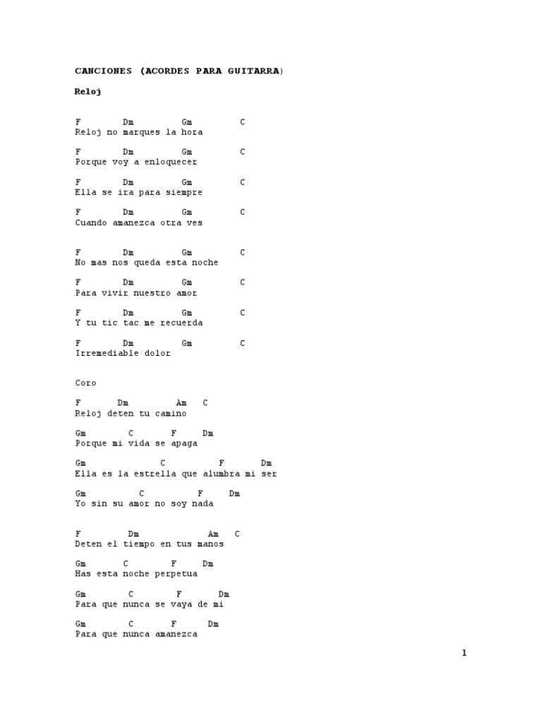 Reloj F Dm Gm Reloj no marques la hora F Dm Gm Porque voy a enloquecer F Dm Gm Ella se ira para siempre F Dm Gm Cuando amanezca otra ves F Dm Gm No mas nos queda esta noche F Dm Gm Para vivir nuestro amor F Dm Gm Y tu tic tac me recuerda F Dm Irremediable dolor Coro F Dm Am Reloj deten tu camino C Gm C C C C