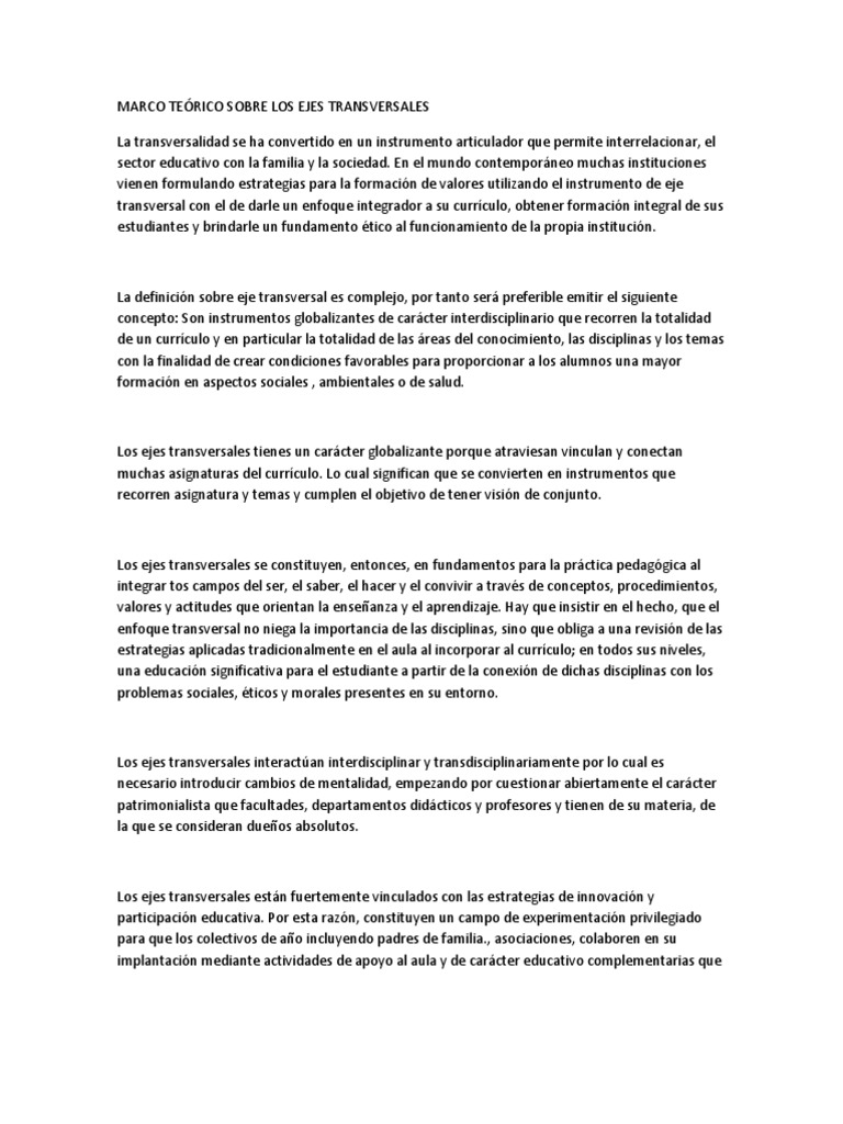 Los nuevos modelos curriculares suelen fundamentarse en la "transversaldad", o ejes transversales que se insertan en los currculos con el fin de cumplir objetivos especficos de proporcionar elementos para la transformacin de la educacin. Los ejes transversales permiten establecer una articulacin entre la educacin fundamentada en las disciplinas del saber, los temas y las asignaturas con las carreras de educacin superior para formar profesionales integrales.