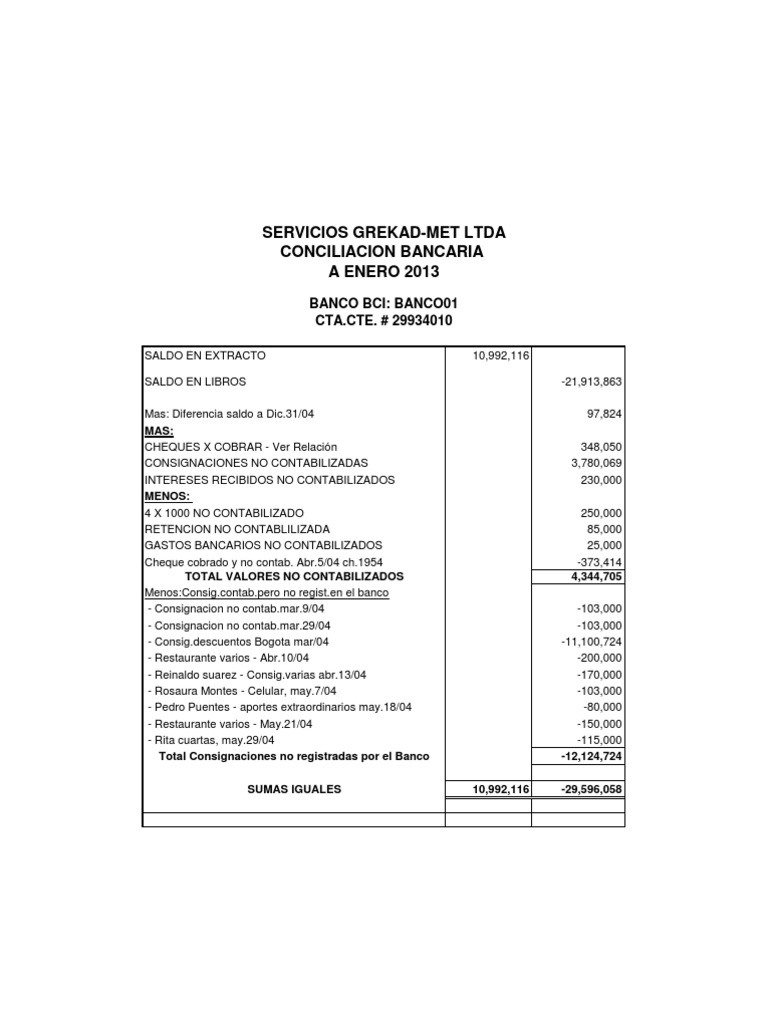 SERVICIOS GREKAD-MET LTDA CONCILIACION BANCARIA A ENERO 2013