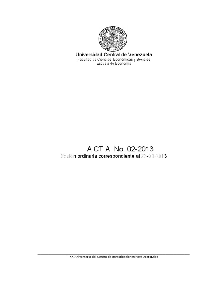 Acta No. 02-13 correspondiente a la sesin ordinaria del 23-01-2013 1. Qurum: Directora (E), Ana Blanco; Luis Noguera, Jefe del Departamento de Materias Formativas; los Representantes Profesorales: Mara Rita Amelii, Catalina Banko y Carlos Pea; los Representantes Estudiantiles: Mara Rodrguez, Alejandro Castro. Tambin asisti el Profesor Rafael Rodrguez, Coordinador Acadmico. Inasistentes: Francisco Vivancos, Jefe del Departamento de Economa Terica, los Representantes Profesorales: Ligia Gonzlez, Juan Plaja; los Representantes Estudiantiles: Ramn Izquierdo, Guillermo Lara; los Representantes de los Egresados: Ingerson Freites, Jos Manuel Rodrguez. La Profesora Mryori Gonzlez, Jefe del Departamento de Mtodos Cuantitativos, avis que no poda asistir. 2. 3. 3.1