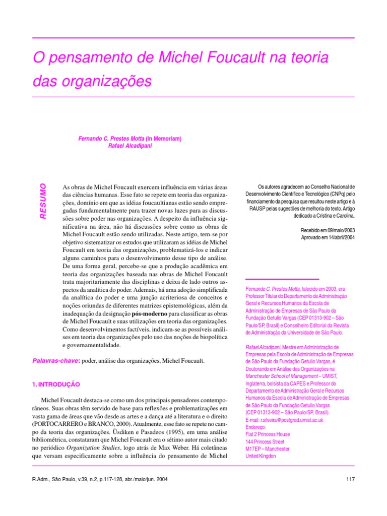 Fernando C. Prestes Motta, falecido em 2003, era Professor Titular do Departamento de Administrao Geral e Recursos Humanos da Escola de Administrao de Empresas de So Paulo da Fundao Getulio Vargas (CEP 01313-902 So Paulo/SP, Brasil) e Conselheiro Editorial da Revista de Administrao da Universidade de So Paulo. Rafael Alcadipani, Mestre em Administrao de Empresas pela Escola de Administrao de Empresas de So Paulo da Fundao Getulio Vargas, Doutorando em Anlise das Organizaes na Manchester School of Management UMIST, Inglaterra, bolsista da CAPES e Professor do Departamento de Administrao Geral e Recursos Humanos da Escola de Administrao de Empresas de So Paulo da Fundao Getulio Vargas (CEP 01313-902 So Paulo/SP, Brasil). E-mail: r.silveira@postgrad.umist.ac.uk Endereo: Flat 2 Princess House 144 Princess Street M17EP Manchester United Kingdon