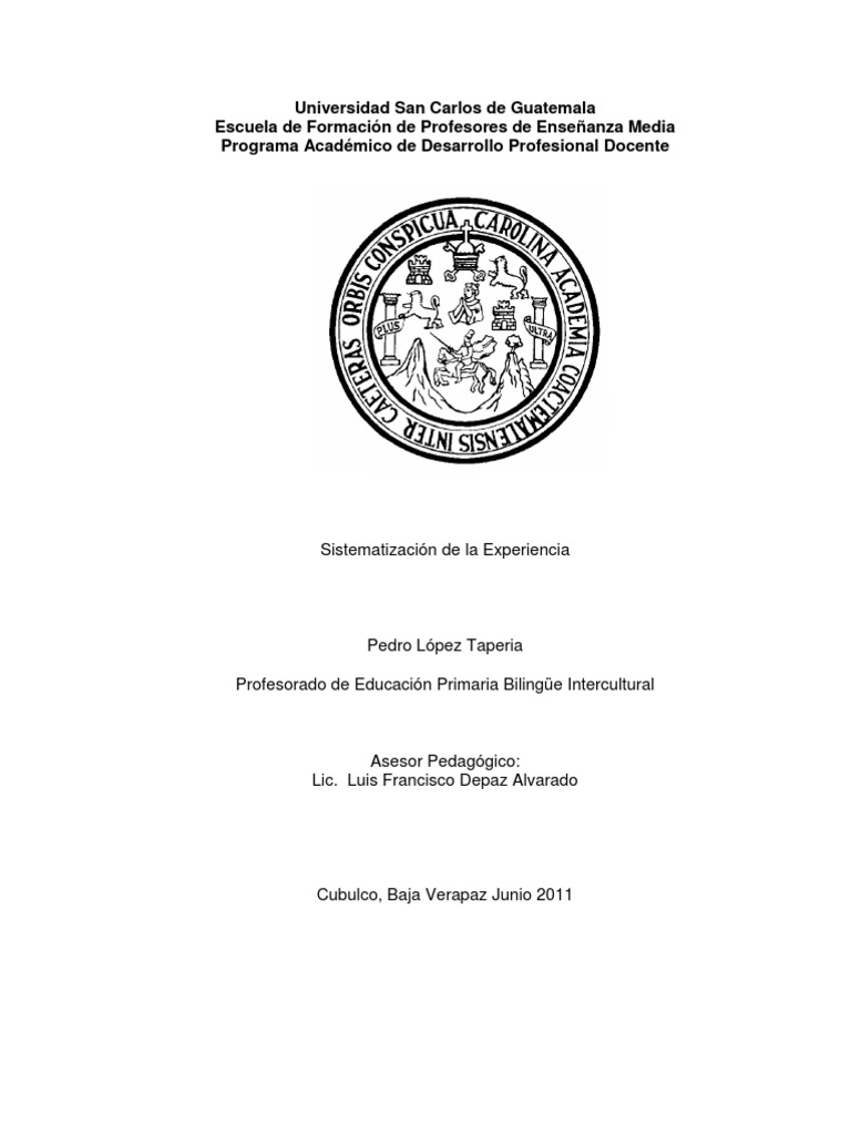 1.1 Ttulo: Informe de sistematizacin de la experiencia: Influencia del programa acadmico de desarrollo profesional docente PADEP/D en la transformacin del maestro en el aula, realizado en la Escuela Oficial Rural Mixta del Casero Piedras Blancas de la Aldea Patzijn del municipio de Cubulco del departamento de Baja Verapaz de julio 2009 a mayo 2011.