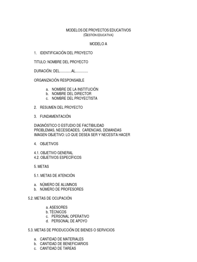 MODELOS DE PROYECTOS EDUCATIVOS (GESTIN EDUCATIVA) MODELO A 1. IDENTIFICACIN DEL PROYECTO TITULO: NOMBRE DEL PROYECTO DURACIN: DEL.............AL..............