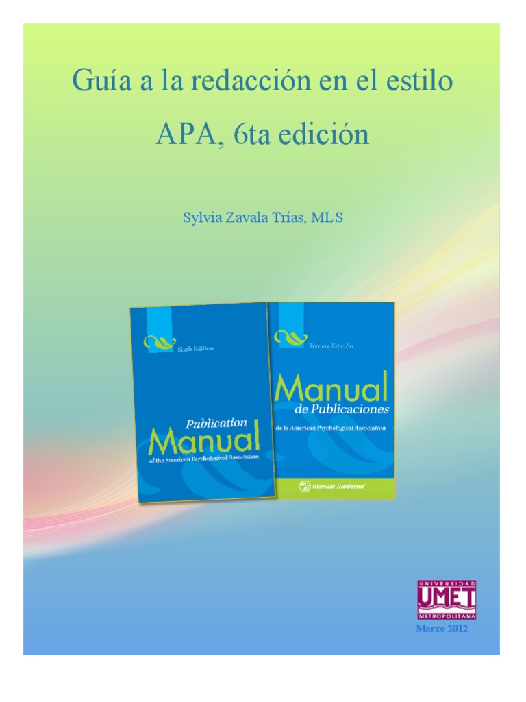 La mayora de los profesores de la Universidad Metropolitana les requieren a sus estudiantes que utilicen la ltima edicin del Manual de publicaciones de la American Psychological Association al redactar sus trabajos de investigacin. Esta gua provee un resumen de los aspectos ms consultados por los usuarios de la Biblioteca de la Universidad Metropolitana en Cupey. Para que pueda consultar los detalles en el manual, se incluye los nmeros de las secciones y/o pginas de la versin en espaol. La gua no es exhaustiva, por lo que siempre ser necesario consultar el libro que est disponible en nuestra Sala de Referencia. Tambin puede acceder a [Link], la pgina Web de la APA.