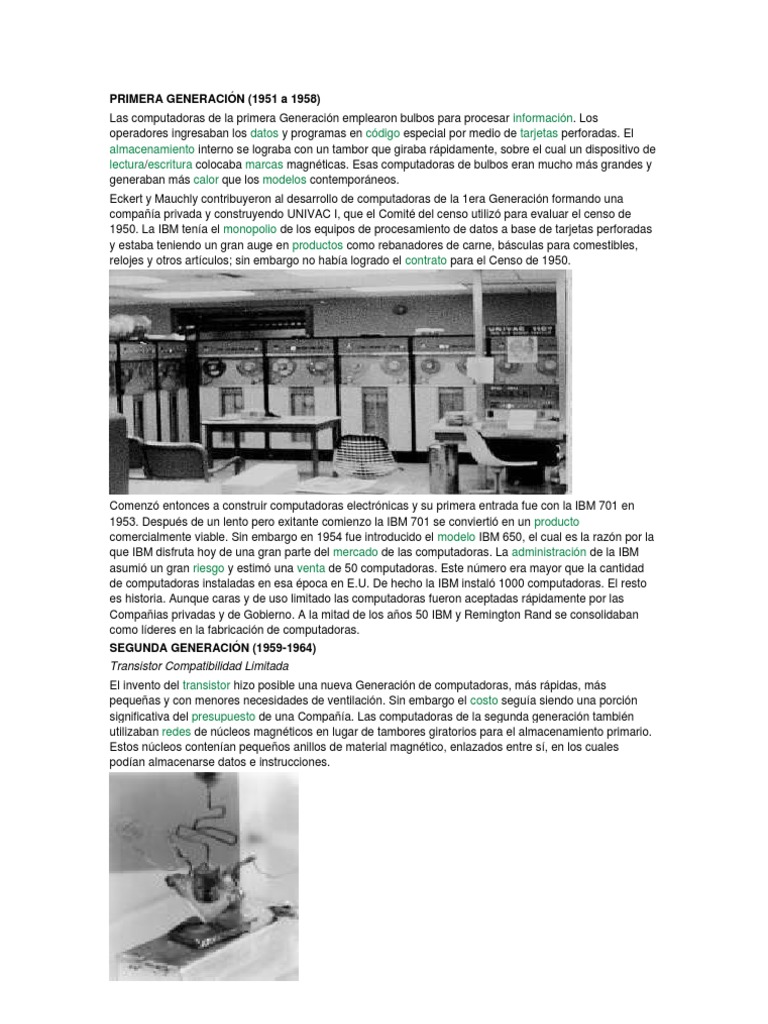 Comenz entonces a construir computadoras electrnicas y su primera entrada fue con la IBM 701 en 1953. Despus de un lento pero exitante comienzo la IBM 701 se convierti en un producto comercialmente viable. Sin embargo en 1954 fue introducido el modelo IBM 650, el cual es la razn por la que IBM disfruta hoy de una gran parte del mercado de las computadoras. La administracin de la IBM asumi un gran riesgo y estim una venta de 50 computadoras. Este nmero era mayor que la cantidad de computadoras instaladas en esa poca en E.U. De hecho la IBM instal 1000 computadoras. El resto es historia. Aunque caras y de uso limitado las computadoras fueron aceptadas rpidamente por las Compaias privadas y de Gobierno. A la mitad de los aos 50 IBM y Remington Rand se consolidaban como lderes en la fabricacin de computadoras. SEGUNDA GENERACIN (1959-1964) Transistor Compatibilidad Limitada El invento del transistor hizo posible una nueva Generacin de computadoras, ms rpidas, ms pequeas y con menores necesidades de ventilacin. Sin embargo el costo segua siendo una porcin significativa del presupuesto de una Compaa. Las computadoras de la segunda generacin tambin utilizaban redes de ncleos magnticos en lugar de tambores giratorios para el almacenamiento primario. Estos ncleos contenan pequeos anillos de material magntico, enlazados entre s, en los cuales podan almacenarse datos e instrucciones.