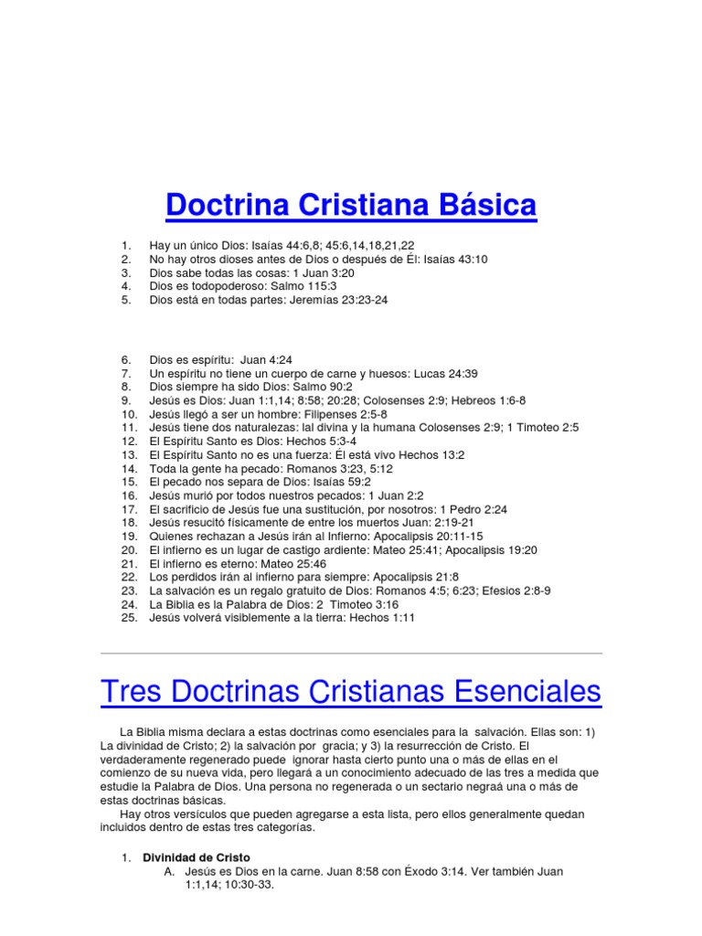 Dios es espritu: Juan 4:24 Un espritu no tiene un cuerpo de carne y huesos: Lucas 24:39 Dios siempre ha sido Dios: Salmo 90:2 Jess es Dios: Juan 1:1,14; 8:58; 20:28; Colosenses 2:9; Hebreos 1:6-8 Jess lleg a ser un hombre: Filipenses 2:5-8 Jess tiene dos naturalezas: lal divina y la humana Colosenses 2:9; 1 Timoteo 2:5 El Espritu Santo es Dios: Hechos 5:3-4 El Espritu Santo no es una fuerza: l est vivo Hechos 13:2 Toda la gente ha pecado: Romanos 3:23, 5:12 El pecado nos separa de Dios: Isaas 59:2 Jess muri por todos nuestros pecados: 1 Juan 2:2 El sacrificio de Jess fue una sustitucin, por nosotros: 1 Pedro 2:24 Jess resucit fsicamente de entre los muertos Juan: 2:19-21 Quienes rechazan a Jess irn al Infierno: Apocalipsis 20:11-15 El infierno es un lugar de castigo ardiente: Mateo 25:41; Apocalipsis 19:20 El infierno es eterno: Mateo 25:46 Los perdidos irn al infierno para siempre: Apocalipsis 21:8 La salvacin es un regalo gratuito de Dios: Romanos 4:5; 6:23; Efesios 2:8-9 La Biblia es la Palabra de Dios: 2 Timoteo 3:16 Jess volver visiblemente a la tierra: Hechos 1:11