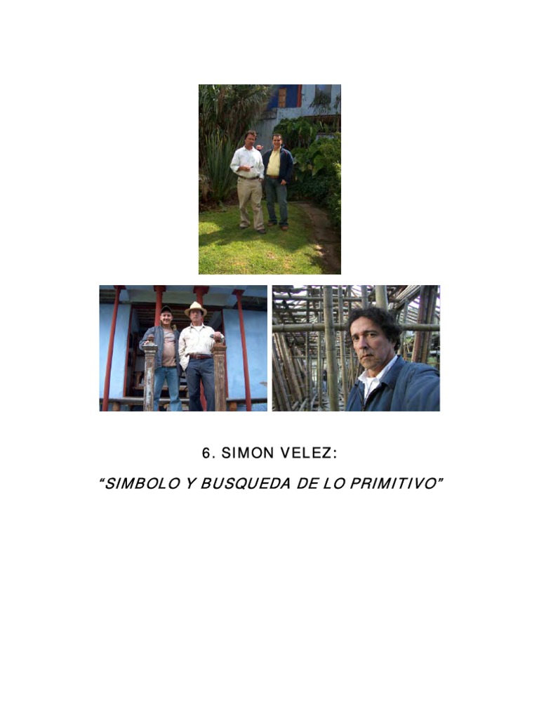 Simn Vlez naci en Manizales-Colombia en el ao de 1949, realiz estudios de arquitectura y arte en la universidad de los andes, en Bogot, entre 1969 y 1975. En 1980 se grada de arquitecto en esa universidad. Nacido en una familia de constructores un abuelo colonizador y constructor su padre un importante arquitecto manizalita, sus intereses iniciales estuvieron dirigidos hacia la tradicin constructiva de la regin cafetera del Viejo Caldas, inters que se ampliar a las culturas populares y primitivas.58 Despus de muchas discusiones y anlisis sobre las posibilidades de la manera ms objetiva de abordar la obra de Simn Vlez y para efectos de una mejor comprensin del proceso evolutivo del sistema constructivo implementado por Vlez. Hemos llegado a la conclusin que es preciso estructurarlo a travs de tres (3) grandes lneas, una primera lnea ser la Arquitectura, una segunda lnea Construccin y la tercera Ingeniera, que, aunque siempre han estado unidas, es necesario saber diferenciarlas claramente, estudiarlas y por supuesto, analizarlas por separado. A continuacin realizaremos un anlisis de su propuesta arquitectnica obra, a partir cada uno de estos tres (3) aspectos: