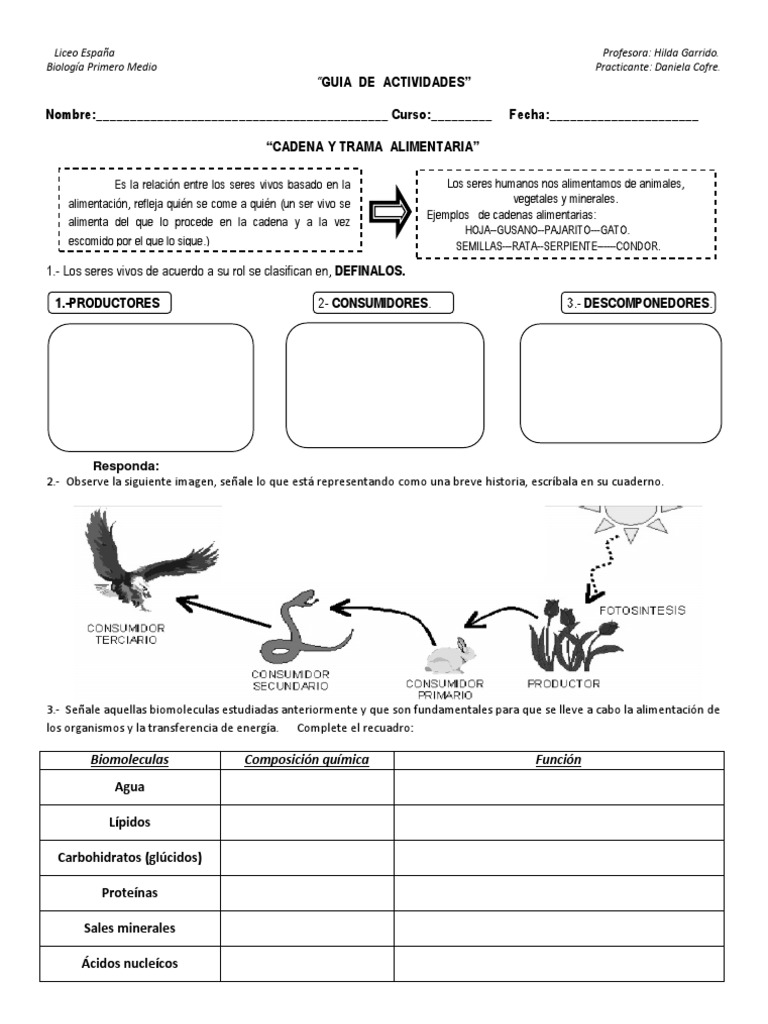 3.- Seale aquellas biomoleculas estudiadas anteriormente y que son fundamentales para que se lleve a cabo la alimentacin de los organismos y la transferencia de energa. Complete el recuadro: