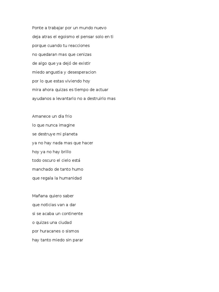 Amanece un dia frio lo que nunca imagine se destruye mi planeta ya no hay nada mas que hacer hoy ya no hay brillo todo oscuro el cielo est manchado de tanto humo que regala la humanidad