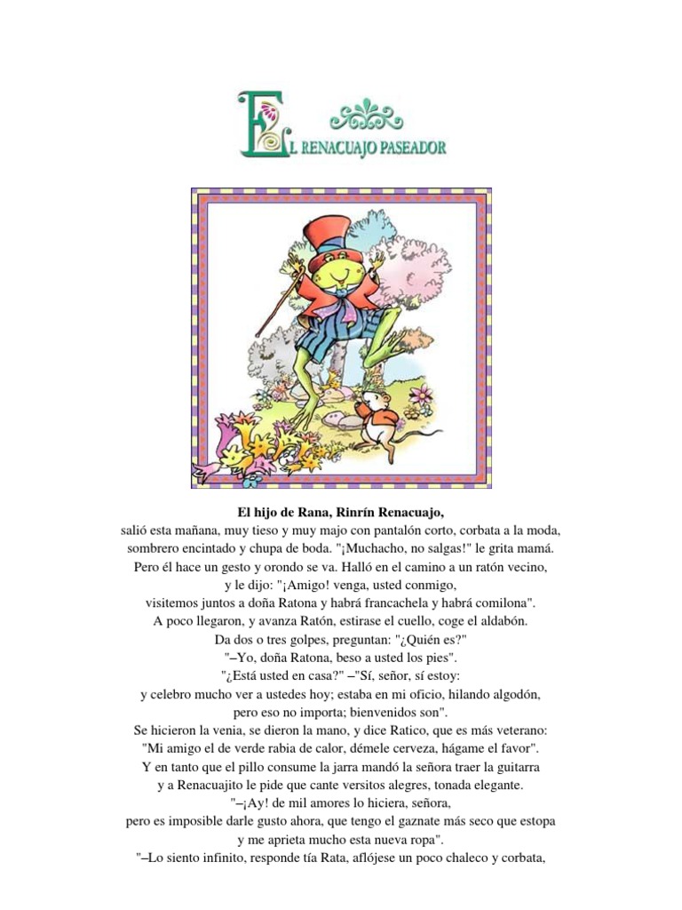 a la moda, sombrero encintado y chupa de boda. "Muchacho, no salgas!" le grita mam. Pero l hace un gesto y orondo se va. Hall en el camino a un ratn vecino, y le dijo: "Amigo! venga, usted conmigo, visitemos juntos a doa Ratona y habr francachela y habr comilona". A poco llegaron, y avanza Ratn, estirase el cuello, coge el aldabn. Da dos o tres golpes, preguntan: "Quin es?" "Yo, doa Ratona, beso a usted los pies". "Est usted en casa?" "S, seor, s estoy: y celebro mucho ver a ustedes hoy; estaba en mi oficio, hilando algodn, pero eso no importa; bienvenidos son". Se hicieron la venia, se dieron la mano, y dice Ratico, que es ms veterano: "Mi amigo el de verde rabia de calor, dmele cerveza, hgame el favor". Y en tanto que el pillo consume la jarra mand la seora traer la guitarra y a Renacuajito le pide que cante versitos alegres, tonada elegante. "Ay! de mil amores lo hiciera, seora, pero es imposible darle gusto ahora, que tengo el gaznate ms seco que estopa y me aprieta mucho esta nueva ropa". "Lo siento infinito, responde ta Rata, afljese un poco chaleco y corbata,