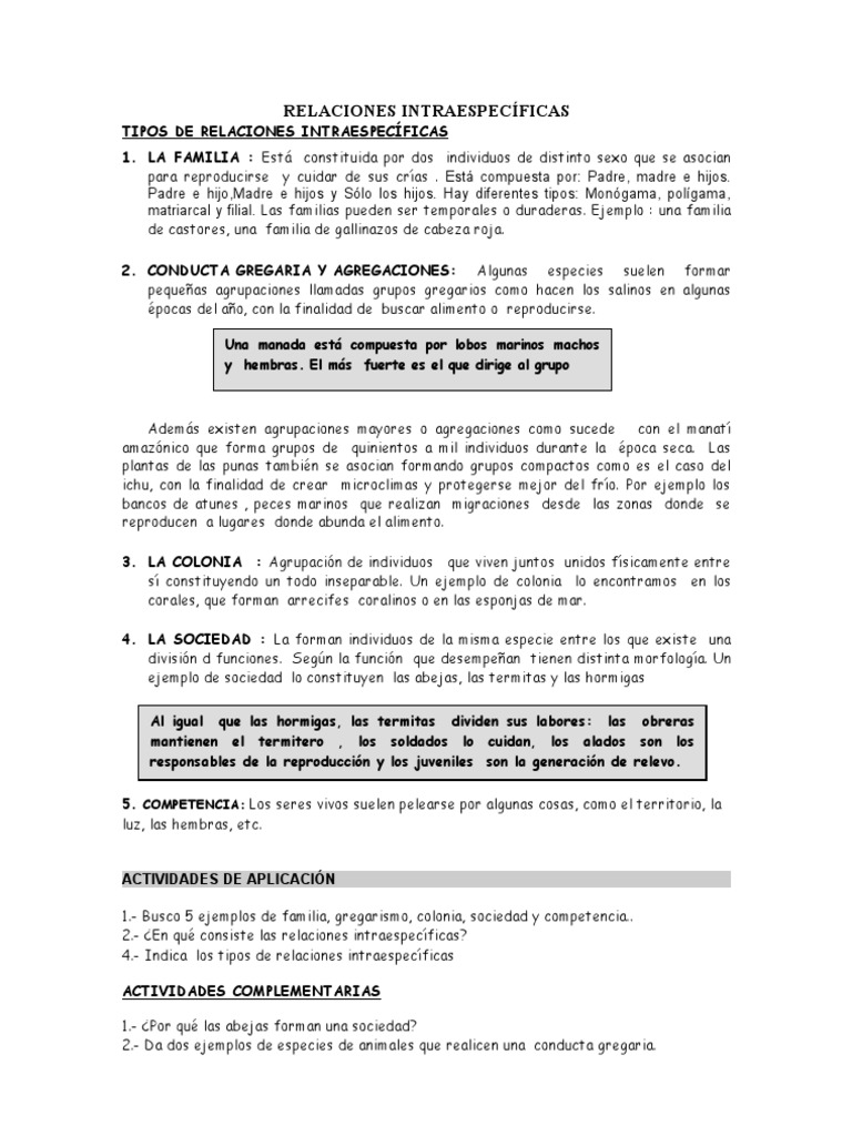 ACTIVIDADES DE APLICACIN 1.- Busco 5 ejemplos de familia, gregarismo, colonia, sociedad y competencia.. 2.- En qu consiste las relaciones intraespecficas? 4.- Indica los tipos de relaciones intraespecficas ACTIVIDADES COMPLEMENTARIAS 1.- Por qu las abejas forman una sociedad? 2.- Da dos ejemplos de especies de animales que realicen una conducta gregaria.