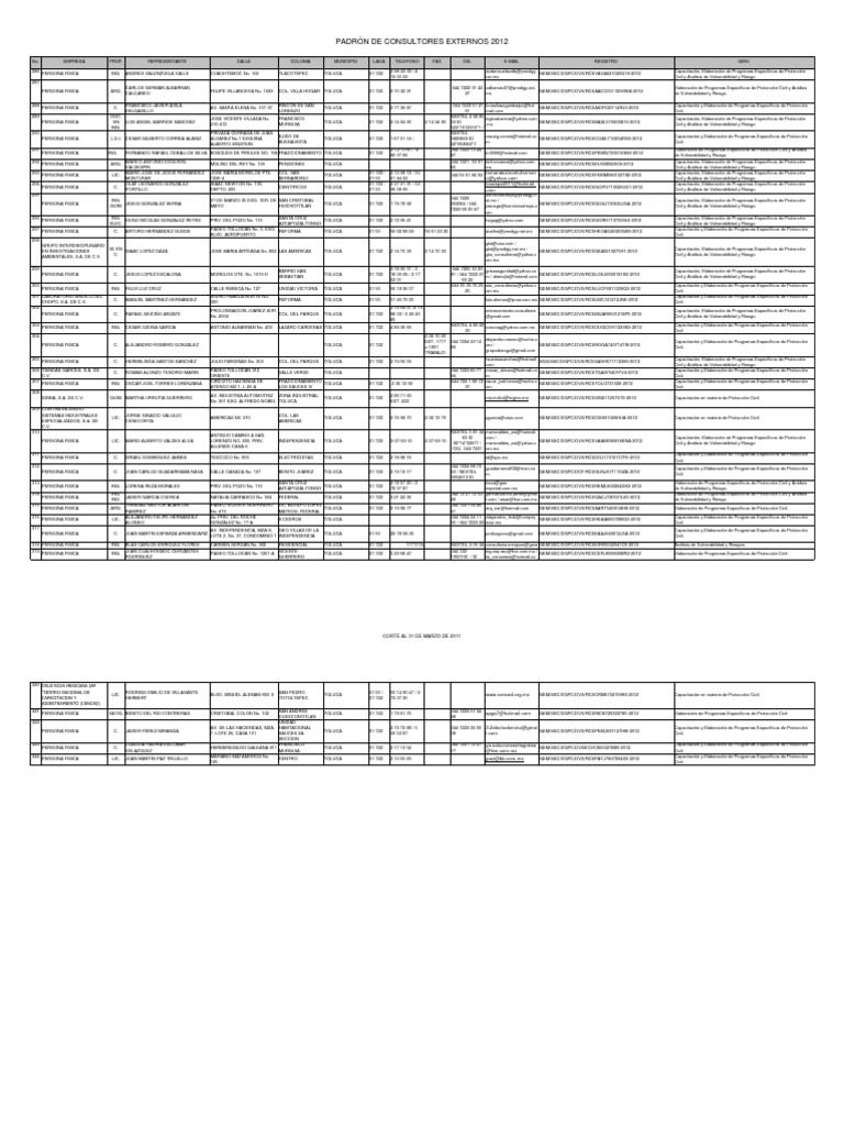 No. 286 287 PERSONA FISICA 288 289 PERSONA FISICA 290 PERSONA FISICA 291 292 293 294 295 PERSONA FISICA 296 297 298 GRUPO INTERDISCIPLINARIO EN INVESTIGACIONES AMBIENTALES, S.A. DE C.V. 299 PERSONA FISICA 300 PERSONA FISICA C. ING. C. C. ING. JESUS LOPEZ ESCALONA FELIX LUZ CRUZ MANUEL MARTINEZ HERNANDEZ RAFAEL MUCIO ARZATE CESAR OZUNA GARCIA MORELOS OTE. No. 1015-D CALLE REBECA No. 127 ISIDRO FABELA NORTE NO. 300 M. EN ISAAC LOPEZ DAZA C. JOSE MARIA ARTEAGA No. 802 LAS AMERICAS TOLUCA 01 722 2 14 70 33 2 14 70 33 ING. JESUS GONZALEZ SERNA QUIM. ING. HUGO NICOLAS GONZALEZ REYES ELEC. C. ARTURO HERNANDEZ OLMOS 21 DE MARZO 35 ESQ. 1ER. DE SAN CRISTOBAL MAYO HUICHOTITLAN PRIV. DEL POZO No. 116 TOLUCA 01 722 1 79 78 92 PERSONA FISICA PERSONA FISICA PERSONA FISICA PERSONA FISICA L.D.I. CESAR GILBERTO CORREA ALANIZ ING. ARQ. LIC. C. ARQ. CARLOS GERMAN ALBARRAN CALCANEO FRANCISCO JAVIER AVILA DELGADILLO FELIPE VILLANUEVA No. 1629 COL. VILLA HOGAR TOLUCA RINCON DE SAN LORENZO FRANCISCO MURGUIA EJIDO DE BUENAVISTA 01 722 2 70 32 91 044 7222 01 42 oalbarran27@prodigy.net. GEM/SSC/DGPC/DVS/RCEAACC5511206WA-2012 27 mx 044 7222 51 21 61 NEXTEL 4 92 85 63 ID 523*1012910*1 / NEXTEL 5820869 ID. 92*853662*1 044 7223 73 24 87 044 7221 53 37 45 044 55 61 84 92 fcoavilaseguridadpc@hot mail.com GEM/SSC/DGPC/DVS/RCEAIDF620114RJ0-2012 Elaboracin de Programas Especficos de Proteccin Civil y Anlisis de Vulnerabilidad y Riesgo. Capacitacin y Elaboracin de Programas Especficos de Proteccin Civil. Capacitacin, Elaboracin de Programas Especficos de Proteccin Civil y Anlisis de Vulnerabilidad y Riesgo. Capacitacin y Elaboracin de Programas Especficos de Proteccin Civil. Elaboracin de Programas Especficos de Proteccin Civil y Anlisis de Vulnerabilidad y Riesgo. Capacitacin, Elaboracin de Programas Especficos de Proteccin Civil y Anlisis de Vulnerabilidad y Riesgo. Capacitacin, Elaboracin de Programas Especficos de Proteccin Civil y Anlisis de Vulnerabilidad y Riesgo. Capacitacin, Elaboracin de Programas Especficos de Proteccin Civil y Anlisis de Vulnerabilidad y Riesgo. Capacitacin, Elaboracin de Programas Especficos de Proteccin Civil y Anlisis de Vulnerabilidad y Riesgo. Capacitacin, Elaboracin de Programas Especficos de Proteccin Civil y Anlisis de Vulnerabilidad y Riesgo. Capacitacin y Elaboracin de Programas Especficos de Proteccin Civil. Capacitacin, Elaboracin de Programas Especficos de Proteccin Civil y Anlisis de Vulnerabilidad y Riesgo. EMPRESA PERSONA FISICA PROF. ING. REPRESENTANTE ANDRES VALENZUELA VALLE CALLE CUAUHTEMOC No. 103 COLONIA TLACOTEPEC MUNICIPIO TOLUCA LADA 01 722 TELEFONO 2 98 33 33 / 4 74 55 52 FAX CEL E-MAIL REGISTRO GIRO Capacitacin, Elaboracin de Programas Especficos de Proteccin Civil y Anlisis de Vulnerabilidad y Riesgo.