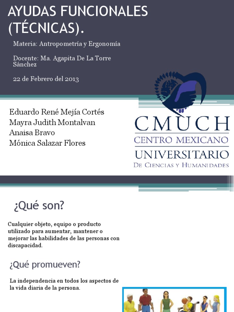 -De las cuales variarn las dimensiones y algunas caractersticas de la ayuda tcnica. - Con el tiempo y el proceso de maduracin, tambin debern cambiar las caractersticas de las ayudas tcnicas, segn las nuevas necesidades que presente la persona en cada etapa. *LOS CAMBIOS ANTES MENCIONADOS IMPLICA DESDE EL CAMBIO DE DIMENSIONES CORPORALES HASTA EN LAS ACTIVIDADES QUE SE REALIZAN.