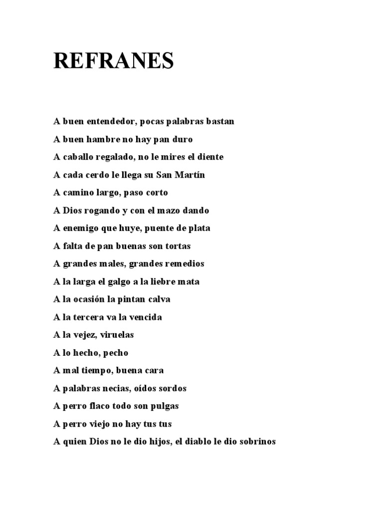 Cra cuervos y te sacarn los ojos Criados, enemigos pagados Cuando el ro suena, agua lleva Cuando las barbas de tu vecino veas pelar, echa las tuyas a remojar Cuando marzo mayea, mayo marcea Dame pan y llmame tonto De aquellos polvos vienen estos lodos De casta le viene al galgo el ser rabilargo De desagradecidos est el infierno lleno De dinero y calidad, la mitad de la mitad De fuera vendr quien de casa te echar De la mano a la boca se pierde la sopa De la mar, el mero, y de la tierra, el carnero De los cuarenta para arriba no te mojes la barriga De noche todos los gatos son pardos De tal palo, tal astilla Del agua mansa me libre Dios, que de la brava me guardar yo Del rbol cado todos hacen lea Del dicho al hecho hay mucho trecho Desnudo nac, desnudo me hallo: ni pierdo ni gano Despus de la tempestad viene la calma Das de mucho, vsperas de nada