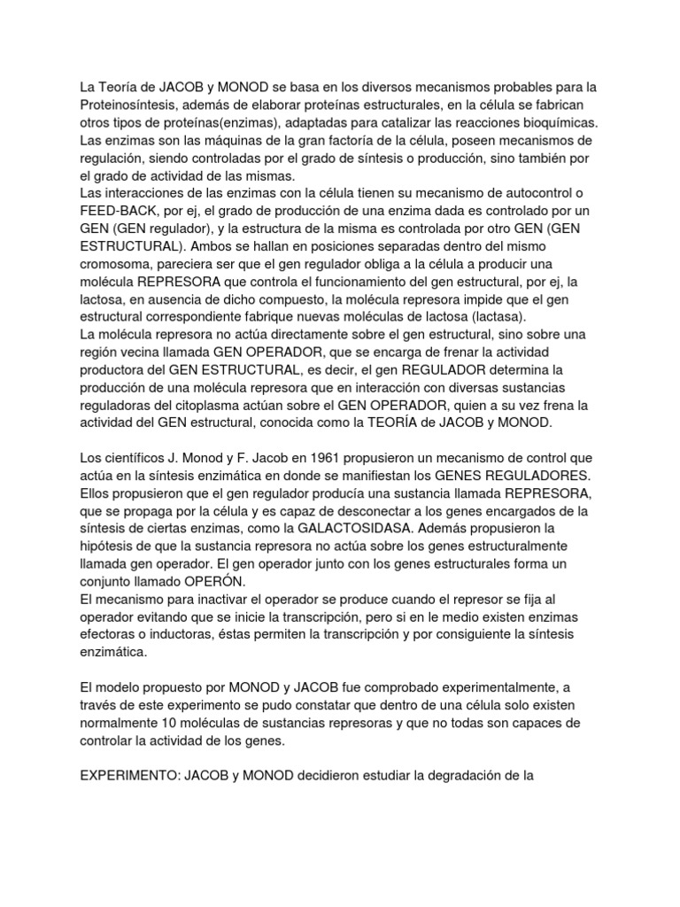La Teora de JACOB y MONOD se basa en los diversos mecanismos probables para la Proteinosntesis, adems de elaborar protenas estructurales, en la clula