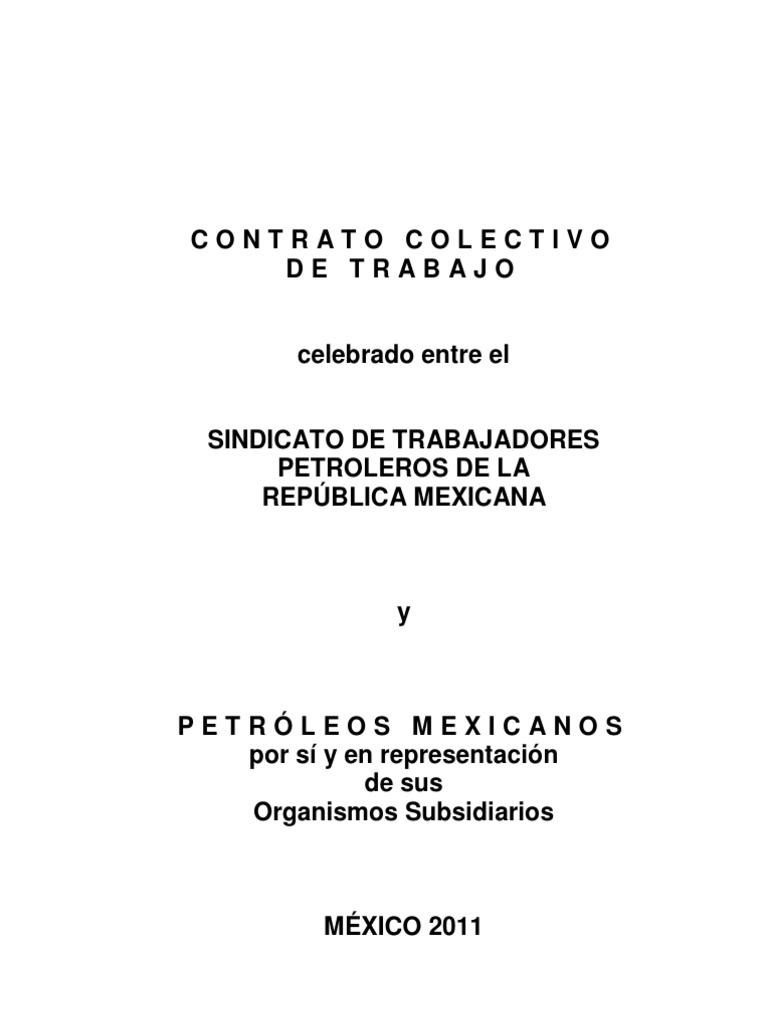 CONTRATO COLECTIVO D E T R A B AJ O que celebran por una parte Petrleos Mexicanos, organismo pblico descentralizado del gobierno federal creado por decreto de 7 de junio de 1938, o como en lo futuro se denomine, por s y en representacin de sus organismos subsidiarios legalmente constituidos y por la otra, por s y en representacin del inters profesional de todos y cada uno de sus miembros, el Sindicato de Trabajadores Petroleros de la Repblica Mexicana, o como en lo venidero se le nombre, organizacin legalmente constituida, con registro en el Departamento Autnomo del Trabajo, hoy Secretara del Trabajo y Previsin Social, bajo el nmero 1131 de 27 de diciembre de 1935, como sindicato de jurisdiccin federal, cuyos estatutos y acta constitutiva son de fecha 15 de agosto del mismo ao y quienes en el curso de este contrato sern designados como el patrn y el sindicato, respectivamente. Este contrato se consigna en las siguientes clusulas: CAPTULO I DISPOSICIONES GENERALES CLUSULA 1. Son objeto de este Contrato Colectivo de Trabajo todos los trabajos y actividades que Petrleos Mexicanos y los organismos subsidiarios realicen en la Repblica Mexicana, para la operacin y el mantenimiento de la Industria y los lleven a cabo con sus propios medios y trabajadores, incluyendo los de distribucin y transporte que ya se atienden en esta forma. Para la correcta aplicacin de este contrato, se establecen las siguientes definiciones: I. CONTRATO. El presente instrumento celebrado entre el patrn y el sindicato, que establece las condiciones generales y especiales bajo las que se presta el trabajo en Petrleos Mexicanos y organismos subsidiarios. II. PATRN. Petrleos Mexicanos y sus organismos