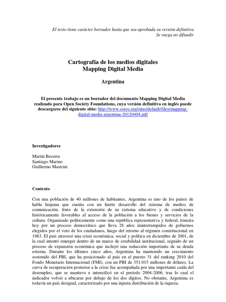 Albornoz, L. Periodismo Digital. Los Grandes Diarios en la Red, Editorial La Cruja Ediciones, Buenos Aires, 2007 Amado, A., La palabra empeanda, Fundacin Friedich Ebert, Buenos Aires, 2010. Becerra, M. y G. Mastrini, Crisis, what crisis? Argentine media in view of the 2008 International Financial Crisis, en International Journal of Communication 4, IJoC, University of Southern California Annenberg, 2010, pp. 611-629. Disponible en: [Link] Carboni, O.. Repensar los conceptos de Acceso y participacin a partir de la implementacin de de la TDT: el caso Argentino, ponencia al 8vo Congreso ENACOM, Jujuy, 2010 De la Torre, L. y M.T. Tramo, La noticia en el espejo, Editorial de la Universidad Catlica Argentina, Buenos Aires, 2008. Estudio de comunicacin/Universidad Austral, Periodistas, empresas e instituciones: claves de una relacin necesaria. Buenos Aires, Universidad Austral, 2008. Malimacci, F. (Director) Primera encuesta sobre creencias y actitudes religiosas en Argentina, Buenos Aires, Conicet, 2008. Marino, S., G. Mastrini G. and M. Becerra. El proceso de regulacin democrtica de la comunicacin en Argentina, en Revista Oficios Terrestres, Ao XVI, N 25, UNLP, 2010 Mascardi, J., Periodismo digital: la polivalencia profesional y los nuevos escenarios profesionales, en Irigaray, F. y otros (eds.) Nuevos medios, nuevos modos, nuevos lenguajes, Laborde editores, Rosario 2008. VVAA, Valor y smbolo, Secretara de Cultura de la Nacin, 2010 Wortman, A. Escenas de los consumes culturales en Argentina, en Buscando seal. Lecturas sobre nuevos hbitos de Consumo Cultural, Ediciones del Centro Cultural Espaa Crdoba, Crdoba, 2009.