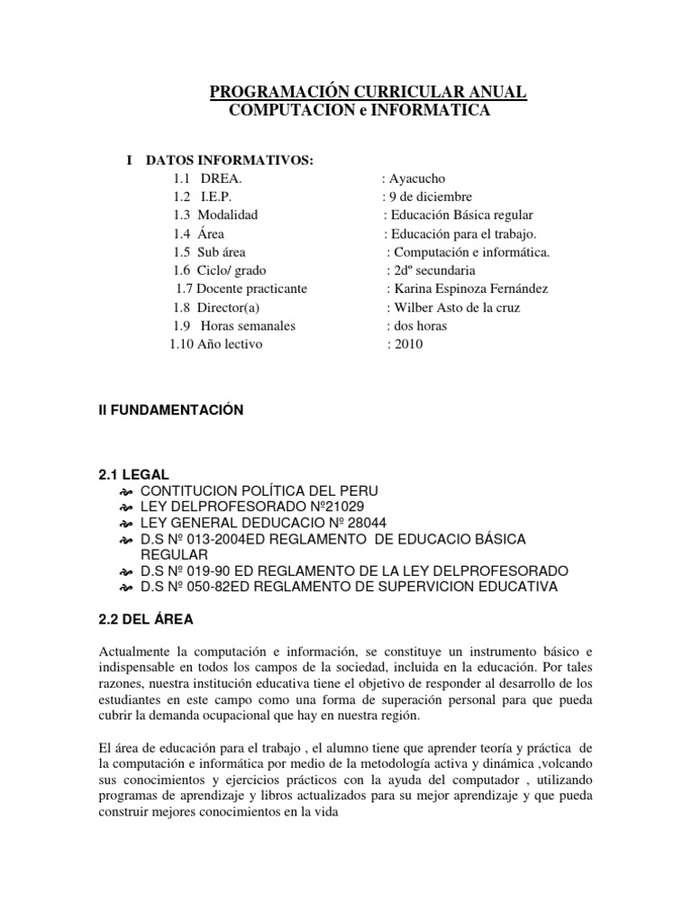 2.1 LEGAL CONTITUCION POLTICA DEL PERU LEY DELPROFESORADO N21029 LEY GENERAL DEDUCACIO N 28044 D.S N 013-2004ED REGLAMENTO DE EDUCACIO BSICA REGULAR D.S N 019-90 ED REGLAMENTO DE LA LEY DELPROFESORADO D.S N 050-82ED REGLAMENTO DE SUPERVICION EDUCATIVA 2.2 DEL REA Actualmente la computacin e informacin, se constituye un instrumento bsico e indispensable en todos los campos de la sociedad, incluida en la educacin. Por tales razones, nuestra institucin educativa tiene el objetivo de responder al desarrollo de los estudiantes en este campo como una forma de superacin personal para que pueda cubrir la demanda ocupacional que hay en nuestra regin. El rea de educacin para el trabajo , el alumno tiene que aprender teora y prctica de la computacin e informtica por medio de la metodologa activa y dinmica ,volcando sus conocimientos y ejercicios prcticos con la ayuda del computador , utilizando programas de aprendizaje y libros actualizados para su mejor aprendizaje y que pueda construir mejores conocimientos en la vida