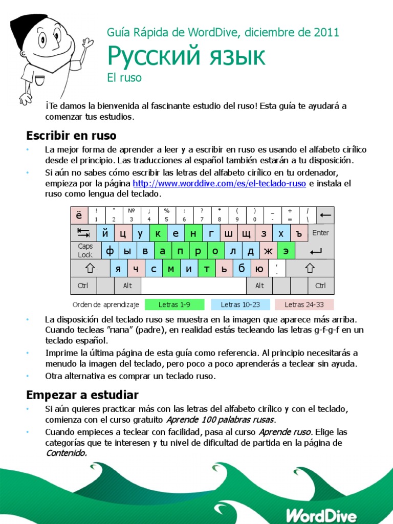 La disposicin del teclado ruso se muestra en la imagen que aparece ms arriba. Cuando tecleas (padre), en realidad ests tecleando las letras g-f-g-f en un teclado espaol. Imprime la ltima pgina de esta gua como referencia. Al principio necesitars a menudo la imagen del teclado, pero poco a poco aprenders a teclear sin ayuda. Otra alternativa es comprar un teclado ruso.