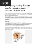 El mtodo factorial es un mtodo difcil de realizar que requiere gran esfuerzo, cooperacin y honestidad de parte de los sujetos estudiados y del investigador. Las principales fuentes de error estn en la COSTO CALORICO DE ALGUNAS ACTIVIDADES acuciosidad y veracidad de los EXPRESADO EN UNIDADES DE METABOLISMO registros y en la posibilidad de BASAL POR HORA reproducir fielmente las diferentes actividades habituales del sujeto Caminar 3.5 Subir escalas 4.0 cuando se estima el costo Subir cerros 7.0 Ciclismo 8.0 energtico de las mismas. Jogging 6.0 Remar 3.5 Nadar 6.0 Esquiar 7.0 -Registro continuo de fre Bowling 3.0 Tenis 7.0 cuencia cardaca: Se ha Futbol 7.0 Golf 5.0 observado que existe una relacin Jardinear 4.5 Pintar paredes 4.5 lineal entre frecuencia cardaca y Gimnasia 4.0 Danza aerbica 5.0 consumo de oxgeno. El carcter de la relacin y la inclinacin de la curva de regresin de consumo de determinada actividad, permite establecer el oxgeno/frecuencia cardaca, vara de uno a costo energtico de dicha actividad. La calori-