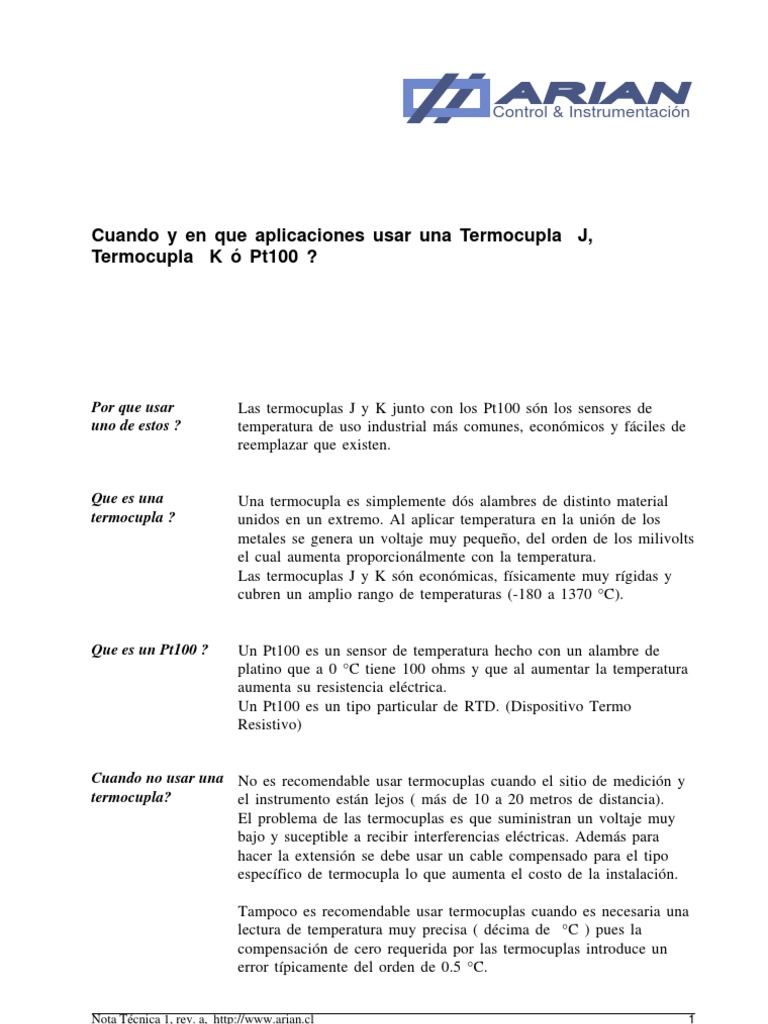 Las termocuplas J y K junto con los Pt100 sn los sensores de temperatura de uso industrial ms comunes, econmicos y fciles de reemplazar que existen.