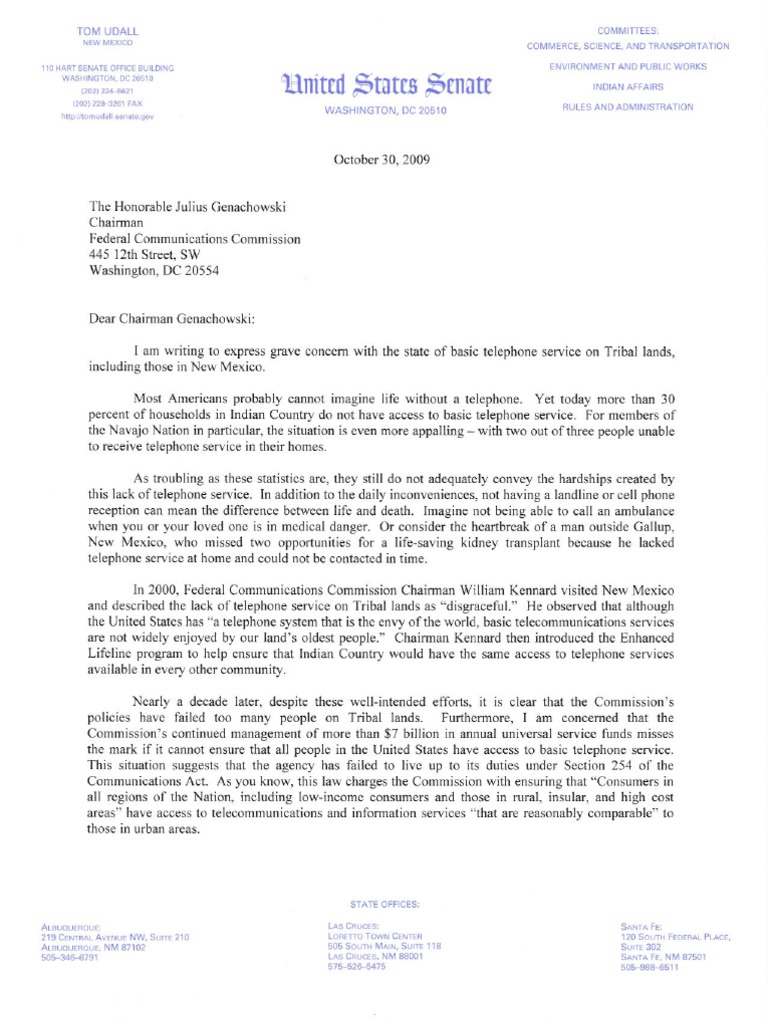 In October 2009, Udall sent a letter to Chairman Genachowski urging him to address lack of basic telecommunications services on Indian lands.