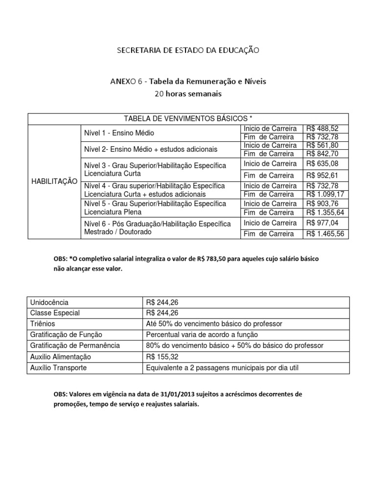 OBS: Valores em vigência na data de 31/01/2013 sujeitos a acréscimos decorrentes de promoções, tempo de serviço e reajustes salariais.