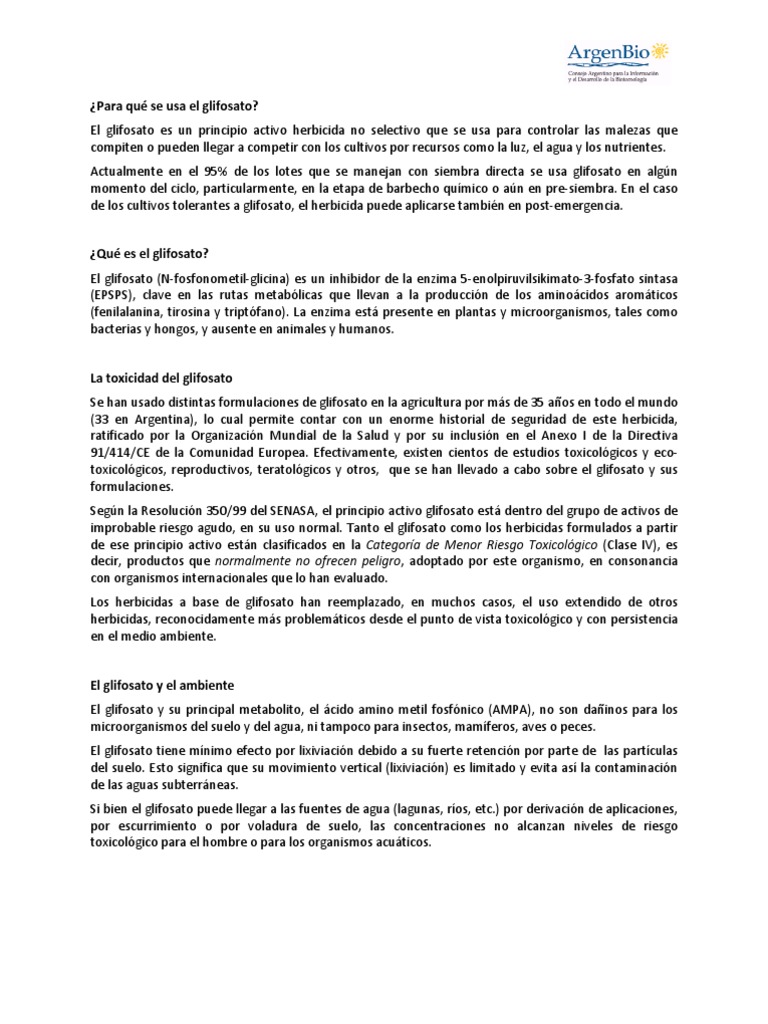 El glifosato es un principio activo herbicida no selectivo que se usa para controlar las malezas que compiten o pueden llegar a competir con los cultivos por recursos como la luz, el agua y los nutrientes. Actualmente en el 95% de los lotes que se manejan con siembra directa se usa glifosato en algn momento del ciclo, particularmente, en la etapa de barbecho qumico o an en pre-siembra. En el caso de los cultivos tolerantes a glifosato, el herbicida puede aplicarse tambin en post-emergencia. Qu es el glifosato? El glifosato (N-fosfonometil-glicina) es un inhibidor de la enzima 5-enolpiruvilsikimato-3-fosfato sintasa (EPSPS), clave en las rutas metablicas que llevan a la produccin de los aminocidos aromticos (fenilalanina, tirosina y triptfano). La enzima est presente en plantas y microorganismos, tales como bacterias y hongos, y ausente en animales y humanos. La toxicidad del glifosato Se han usado distintas formulaciones de glifosato en la agricultura por ms de 35 aos en todo el mundo (33 en Argentina), lo cual permite contar con un enorme historial de seguridad de este herbicida, ratificado por la Organizacin Mundial de la Salud y por su inclusin en el Anexo I de la Directiva 91/414/CE de la Comunidad Europea. Efectivamente, existen cientos de estudios toxicolgicos y ecotoxicolgicos, reproductivos, teratolgicos y otros, que se han llevado a cabo sobre el glifosato y sus formulaciones. Segn la Resolucin 350/99 del SENASA, el principio activo glifosato est dentro del grupo de activos de improbable riesgo agudo, en su uso normal. Tanto el glifosato como los herbicidas formulados a partir de ese principio activo estn clasificados en la Categora de Menor Riesgo Toxicolgico (Clase IV), es decir, productos que normalmente no ofrecen peligro, adoptado por este organismo, en consonancia con organismos internacionales que lo han evaluado. Los herbicidas a base de glifosato han reemplazado, en muchos casos, el uso extendido de otros herbicidas, reconocidamente ms problemticos desde el punto de vista toxicolgico y con persistencia en el medio ambiente. El glifosato y el ambiente El glifosato y su principal metabolito, el cido amino metil fosfnico (AMPA), no son dainos para los microorganismos del suelo y del agua, ni tampoco para insectos, mamferos, aves o peces. El glifosato tiene mnimo efecto por lixiviacin debido a su fuerte retencin por parte de las partculas del suelo. Esto significa que su movimiento vertical (lixiviacin) es limitado y evita as la contaminacin de las aguas subterrneas. Si bien el glifosato puede llegar a las fuentes de agua (lagunas, ros, etc.) por derivacin de aplicaciones, por escurrimiento o por voladura de suelo, las concentraciones no alcanzan niveles de riesgo toxicolgico para el hombre o para los organismos acuticos.
