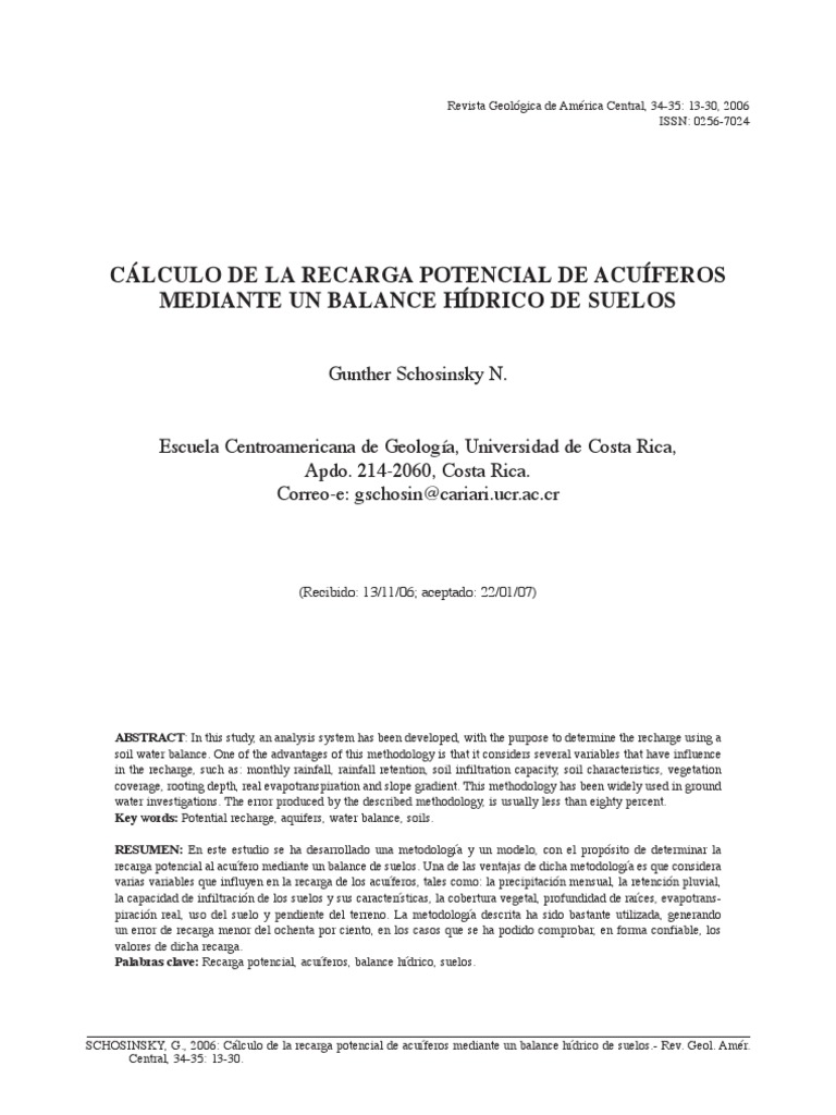 Schosinsky, G., 2006: Clculo de la recarga potencial de acuferos mediante un balance hdrico de suelos.- Rev. Geol. Amr. Central, 34-35: 13-30.