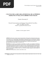ABSTRACT: In this study, an analysis system has been developed, with the purpose to determine the recharge using a soil water balance. One of the advantages of this methodology is that it considers several variables that have influence in the recharge, such as: monthly rainfall, rainfall retention, soil infiltration capacity, soil characteristics, vegetation coverage, rooting depth, real evapotranspiration and slope gradient. This methodology has been widely used in ground water investigations. The error produced by the described methodology, is usually less than eighty percent. Key words: Potential recharge, aquifers, water balance, soils. RESUMEN: En este estudio se ha desarrollado una metodologa y un modelo, con el propsito de determinar la recarga potencial al acufero mediante un balance de suelos. Una de las ventajas de dicha metodologa es que considera varias variables que influyen en la recarga de los acuferos, tales como: la precipitacin mensual, la retencin pluvial, la capacidad de infiltracin de los suelos y sus caractersticas, la cobertura vegetal, profundidad de races, evapotranspiracin real, uso del suelo y pendiente del terreno. La metodologa descrita ha sido bastante utilizada, generando un error de recarga menor del ochenta por ciento, en los casos que se ha podido comprobar, en forma confiable, los valores de dicha recarga. Palabras clave: Recarga potencial, acuferos, balance hdrico, suelos.