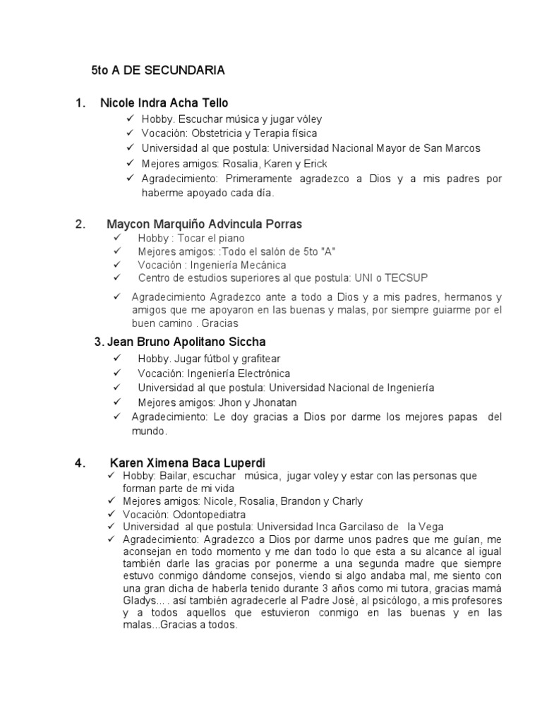 Hobby: Escuchar msica y jugar ftbol Mejores Amigos: Todos mis compaeros del 5 "A" de secundaria. Vocacin: Ingeniera Industrial Universidad al que postula: UNI Agradecimiento: agradezco a Dios, a mis padres, a mis profesores y amigos; por haber estado siempre a mi lado cuando ms los necesitaba, por haberme guiado por el buen camino, por ensearme a ser mejor cada da, y sobre todo por haber hecho de mi un buen hijo, alumno y amigo.
