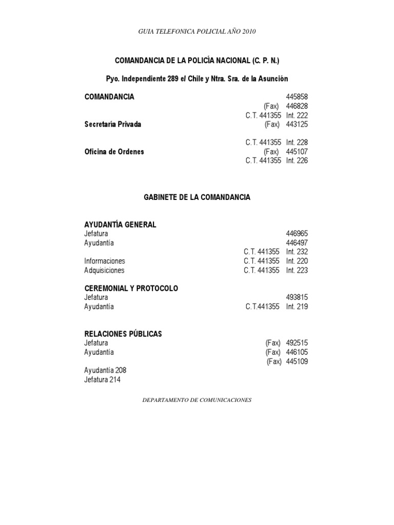COMANDANCIA DE LA POLICA NACIONAL (C. P. N.) Pyo. Independiente 289 e/ Chile y Ntra. Sra. de la Asuncin COMANDANCIA 445858 (Fax) 446828 C.T. 441355 Int. 222 (Fax) 443125 C.T. 441355 Int. 228 (Fax) 445107 C.T. 441355 Int. 226