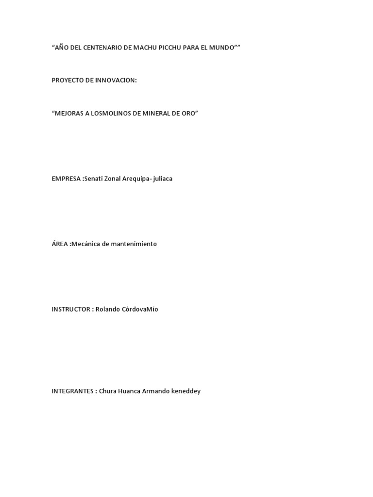 El presente trabajo de innovacin denominado MEJORAS A LOS MOLINOS DE MINERAL DE ORO elaborado por los aprendices de especialidad de Mecnica de Mantenimiento con el propsito de plasmar nuestros conocimientos de dicho tema que ser til para nuestra vida estudiantil.