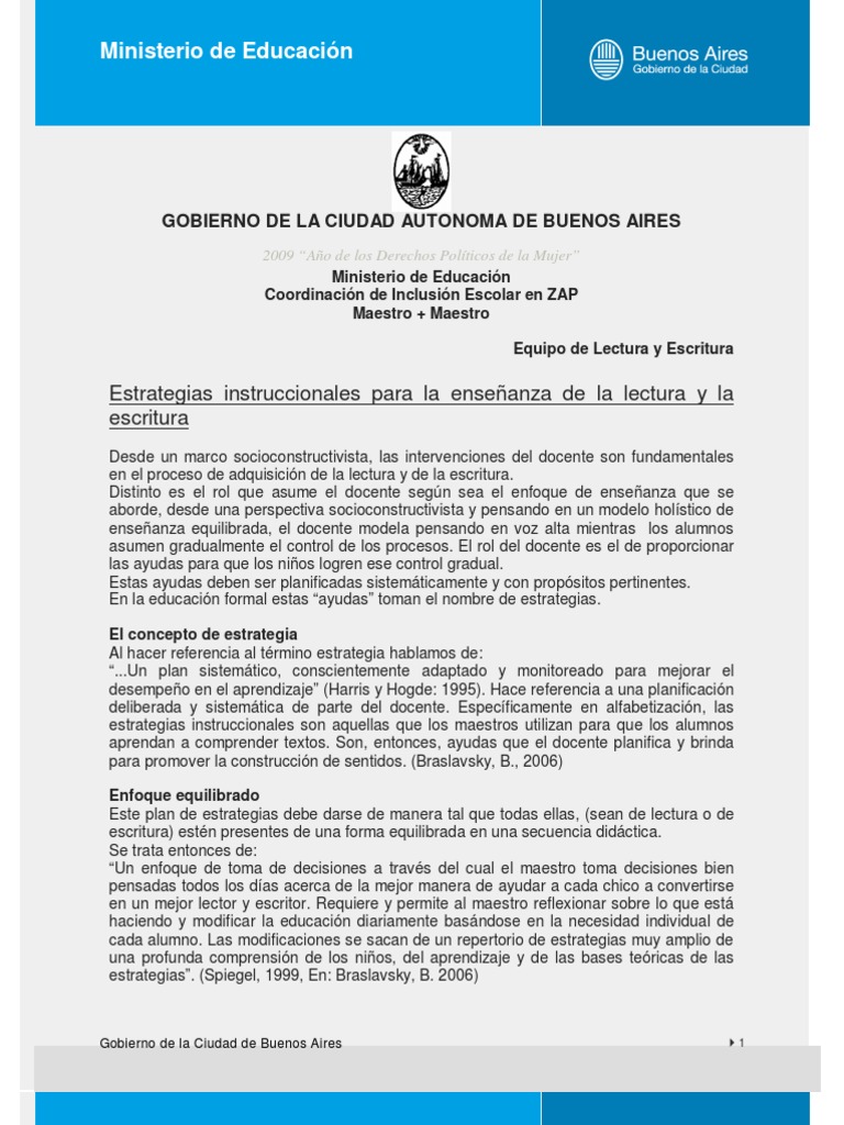 fuentes de informacin disponibles: otras escrituras y otros escritores: el docente principalmente y los compaeros. Escritura independiente Son aquellas situaciones en las que los nios escriben solos. En estos momentos el docente delega gradualmente la responsabilidad del proceso de escritura en los nios. Estas situaciones permiten, por un lado, conocer lo que lo nios pueden hacer solos a fin de establecer las ayudas necesarias para continuar y enriquecer el proceso de adquisicin de la escritura. Por otro lado, instalar la escritura de textos con sentido, desde el comienzo de la escolaridad, como una prctica cotidiana en las aulas, donde el docente brinda a cada nio las ayudas especficas que necesita. Para esto se hace necesario que las consignas de escritura sugeridas por los docentes sean significativas, promuevan a la escritura de textos completos, con un destinatario y un propsito determinado que posibiliten la eleccin del formato textual adecuado. Instalar la prctica de la escritura en la escuela, para promover efectivamente la formacin de escritores competentes, supone ofrecer a los alumnos un mbito donde escribir tiene sentido porque es el medio ms apropiado para cumplir con determinados propsitos.7 Las intervenciones del docente son fundamentales en todas las estrategias descriptas. Si bien se pretende dar cada vez mayor responsabilidad en la lectura y la escritura a los alumnos, a medida que sean lectores y escritores ms autnomos, estas estrategias deben estar presentes a lo largo de toda la escolaridad, resignificndose a medida que los nios avanzan en el proceso de adquisicin de la lectura y escritura. Mara Laura Lpez y Sandra Storino Capacitadoras del Equipo de Lectura y Escritura. Coordinador del Proyecto Maestro + Maestro: Dra Sandra Marder Directora de Inclusin Educativa: Elena Schwartzer Bolvar 191 Segundo piso- Ciudad autnoma de Bs As. Tel: 43435592/93 int. 26 y 27 maestro+maestro@buenosaires.gov.ar