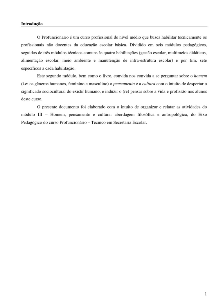 . Dividido em seis mdulos pedaggicos, seguidos de trs mdulos tcnicos comuns s quatro habilitaes (gesto escolar, multimeios didticos, alimentao escolar, meio ambiente e manuteno de infra-estrutura escolar) e por fim, sete especficos a cada habilitao. Este segundo mdulo, bem como o livro, convida nos convida a se perguntar sobre o homem (i.e: os gneros humanos, feminino e masculino) o pensamento e a cultura com o intuito de despertar o significado sociocultural do existir humano, e induzir o (re) pensar sobre a vida e profisso nos alunos deste curso. O presente documento foi elaborado com o intuito de organizar e relatar as atividades do mdulo III Homem, pensamento e cultura: abordagem filosfica e antropolgica, do Eixo Pedaggico do curso Profuncionrio Tcnico em Secretaria Escolar.