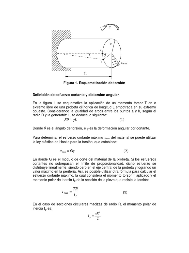 Definicin de esfuerzo cortante y distorsin angular En la figura 1 se esquematiza la aplicacin de un momento torsor T en e extremo libre de una probeta cilndrica de longitud L empotrada en su extremo opuesto. Considerando la igualdad de arcos entre los puntos a y b, segn el radio R y la generatriz L, se deduce lo siguiente: